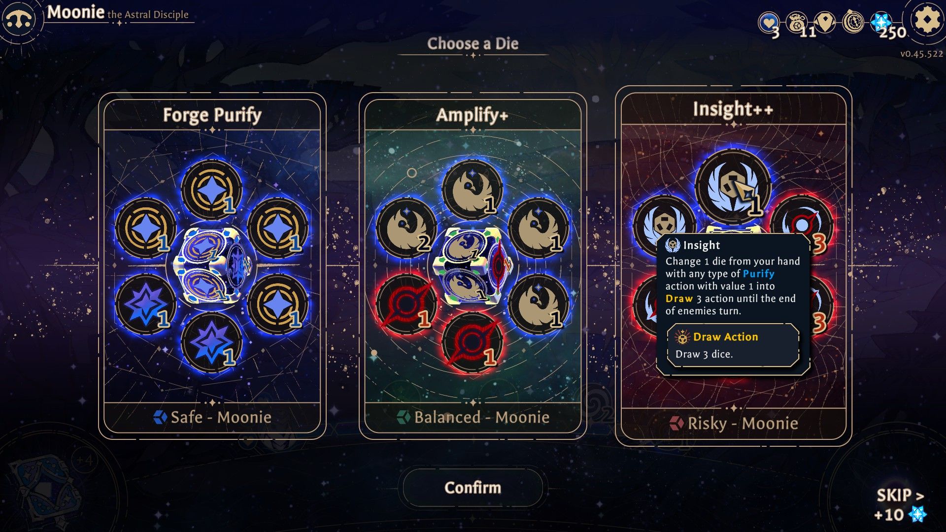 But risk is a relative concept, especially with Astrea's somewhat unorthodox life system. Rather than an HP counter ticking down to zero, all characters have a bar that moves between purity and corruption. Most die faces will advance the bar toward one of these two ends, so a purification face can be used to harm a monster or heal an ally. In some cases, it may be worthwhile to risk a little pain, as an oracle at high corruption gains access to "Virtues" - additional abilities that can be played for free.