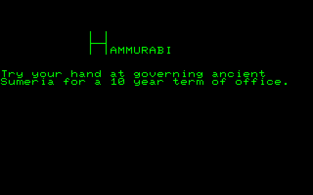 Hammurabi has a very interesting pedigree. It traces inspiration from The Sumerian Game, a multimedia educational strategy game developed in 1964 as an early IBM experiment in using computers in schools. The Sumerian Game is arguably one of the first computer strategy games, and it didn’t stay confined to IBM for long. A simplified version was programmed in the FOCAL language in 1968, which was later converted into the BASIC game Hammurabi.