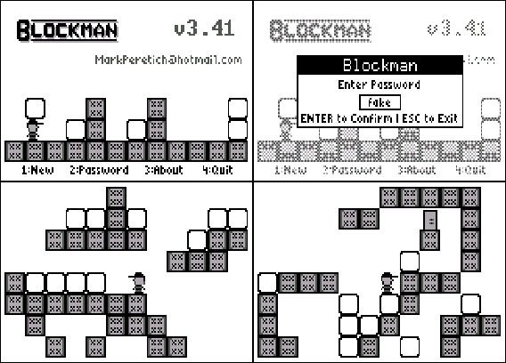 One of the best known members of the TCPA was Brandon Sterner. Sterner was the chief programmer on a number of TI-82 and TI-83 games, including adaptations of Nintendo titles such as Tetris Attack and Yoshi. However, he also produced an original puzzle game called Block Dude. The goal was to help the protagonist - who could climb but not jump - reach a stage exit by carrying and stacking blocks.