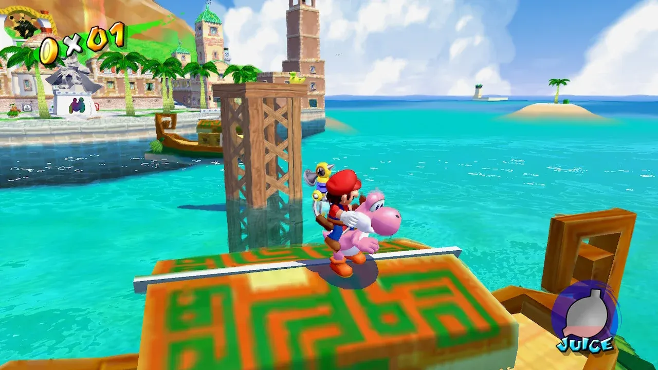 My journey through Super Mario Sunshine started as it often does with platformers: following a story cutscene to set up the plot, I ran around Delfino landing site while getting used to Mario’s move set. Mario’s movements remained much the same as they were in Super Mario 64, minus the long jump, which I missed. However, I found the dive jump to be a fun replacement and appreciated the new twist it added. I found F.L.U.D.D, Mario’s main tool in this adventure, and quickly got used to his control scheme. I found it complemented Mario’s move set while also giving Super Mario Sunshine a unique touch. This all ended with grabbing the first Shine Sprite in the game. Only 119 to go…