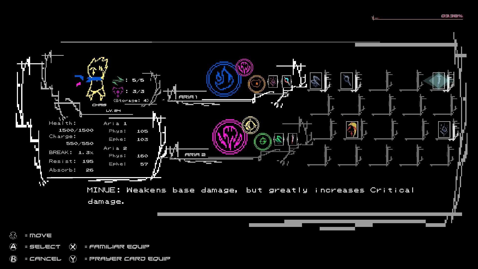 Of course, the game wouldn't be a spectacle fighter without multiple combat options to discover and switch through in real time. Death of a Wish is filled to the brim with these, and action RPG mechanics are also featured for progression. Christian uses weapons called Arias for primary attacks, each with different elements that are strong against certain monsters. Arias can also be equipped as magic spells along with your primary weapon, and some can combine with others to create mixed slashes. Christian can find pets that attack with special abilities as well, including lasers, bomb explosions, and shotgun blasts. All of the offensive weapons scale off of stats you can raise from leveling up. Spells and pet attacks drain points from your charge meter, which can also be leveled up.