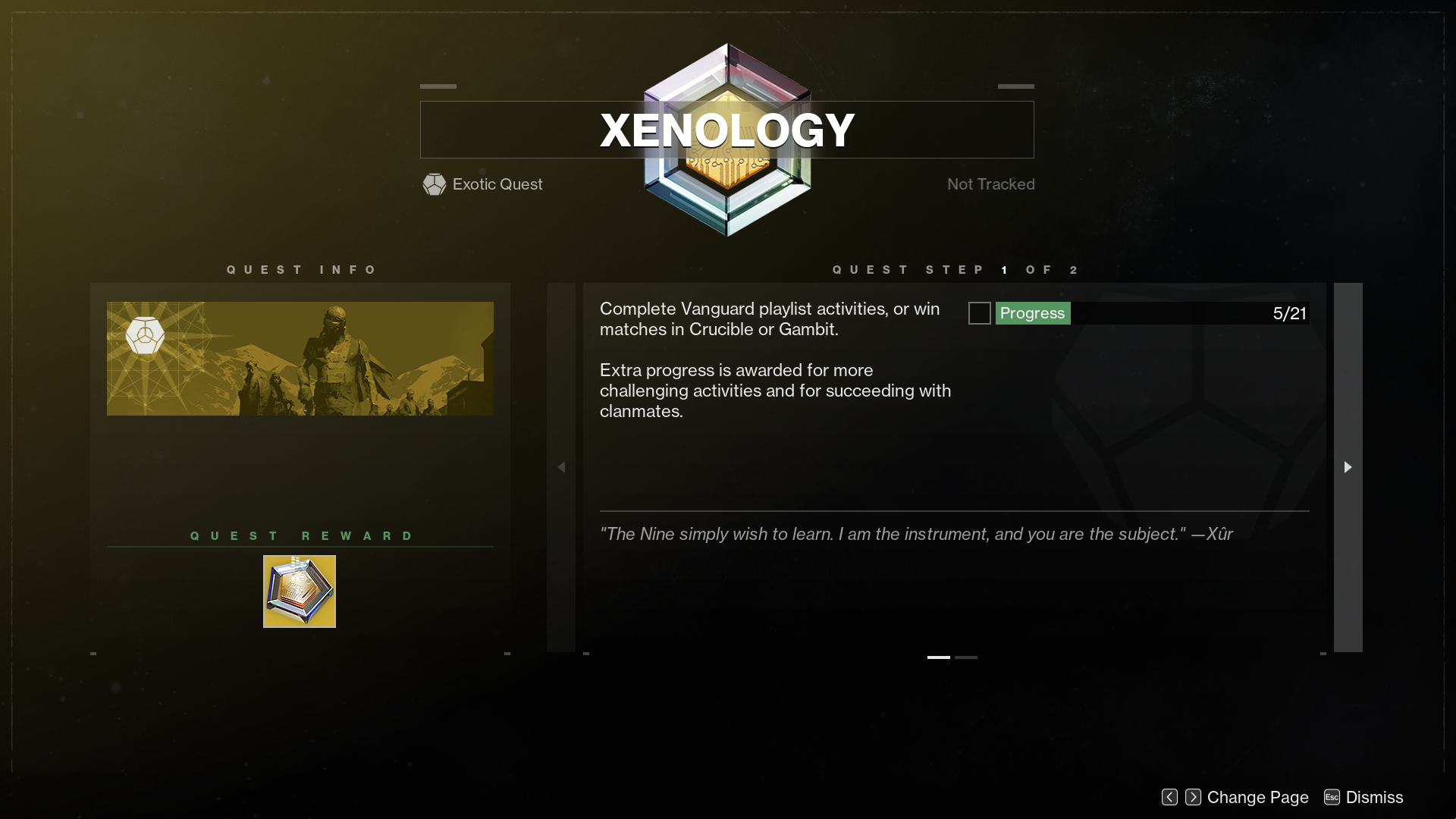 This quest simply tasks you with playing 21 ritual activities in Destiny 2 - Vanguard Ops, Crucible, and Gambit. Complete the quest to earn one Exotic Cipher. Do note, you may only complete this quest once per week and that you can only carry one Exotic cipher at any given time.