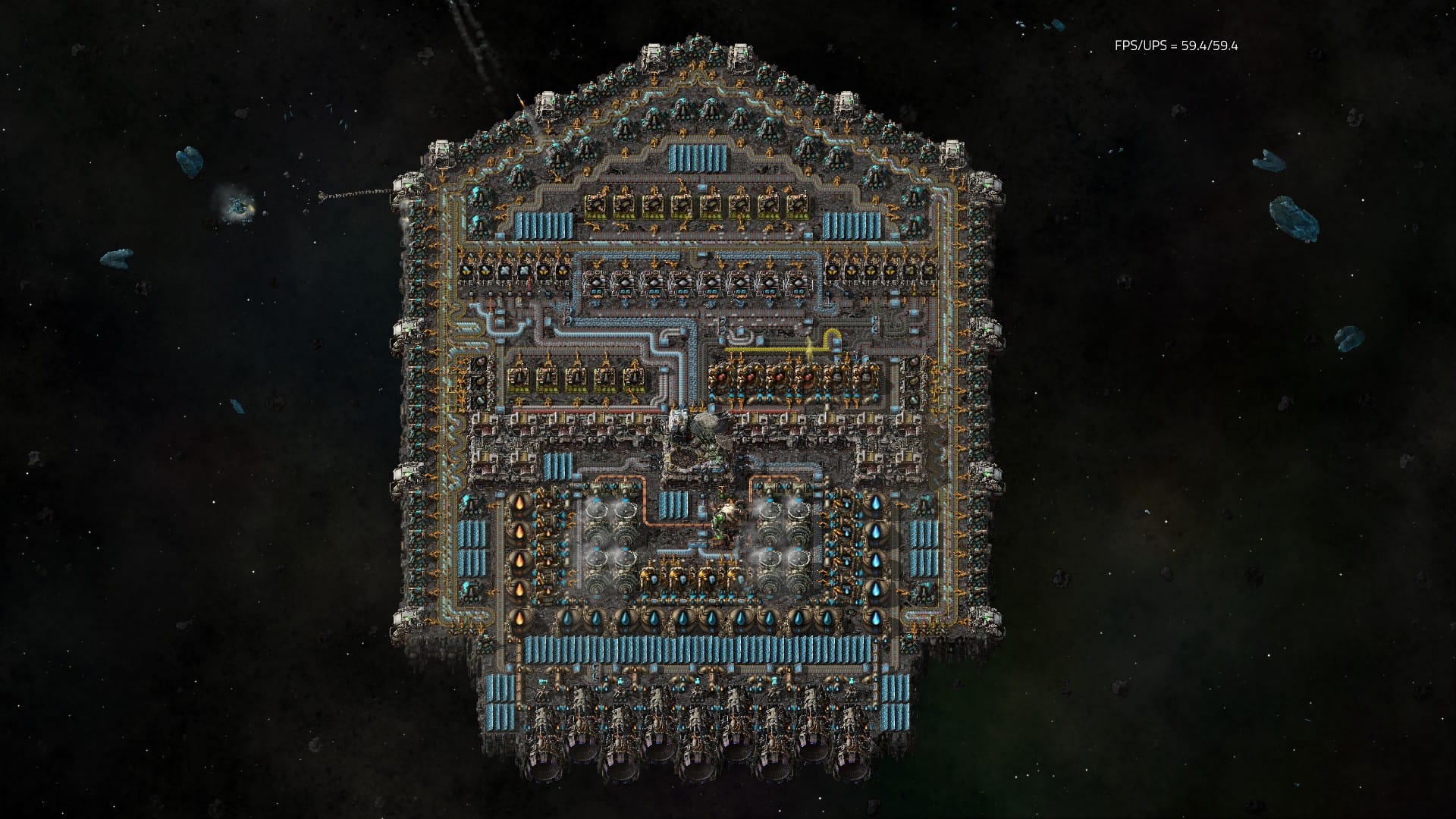 You can build space platforms in orbit around Nauvis (the original planet), but all building materials have to be launched up via rockets with limited capacity. Just like the rest of the game, space platforms are fully customizable and you can create interesting and unique designs. On them, you can mine small asteroids and manufacture space science to continue in the tech tree.