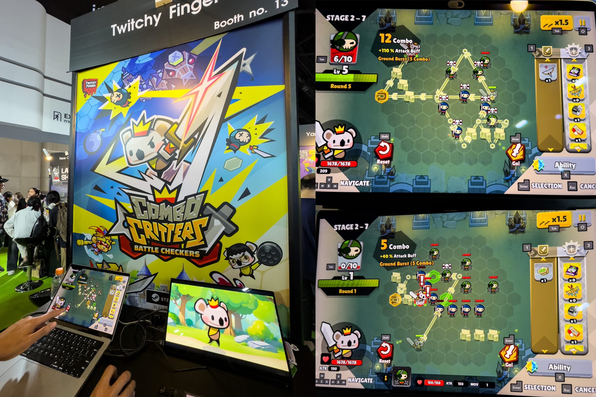 Ever heard of battle chess? Combo Critters: Battle Checkers asks "Why not battle checkers?" Developed by Hong Kong's Twitchy Finger Ltd., a studio moving from mobile over to Steam to escape all that free-to-play baggage, this game is fast, addictive, and one of the most original I tried at the show. Boiled down, it's a strategic, combo-driven twist on checkers. The board looks somewhat familiar, but your pieces are cute koalas facing off against an army of ninja enemies. Now, I’m no checkers expert (I actually have no idea how to play it), so the dev walked me through the basics, which I picked up in no time.