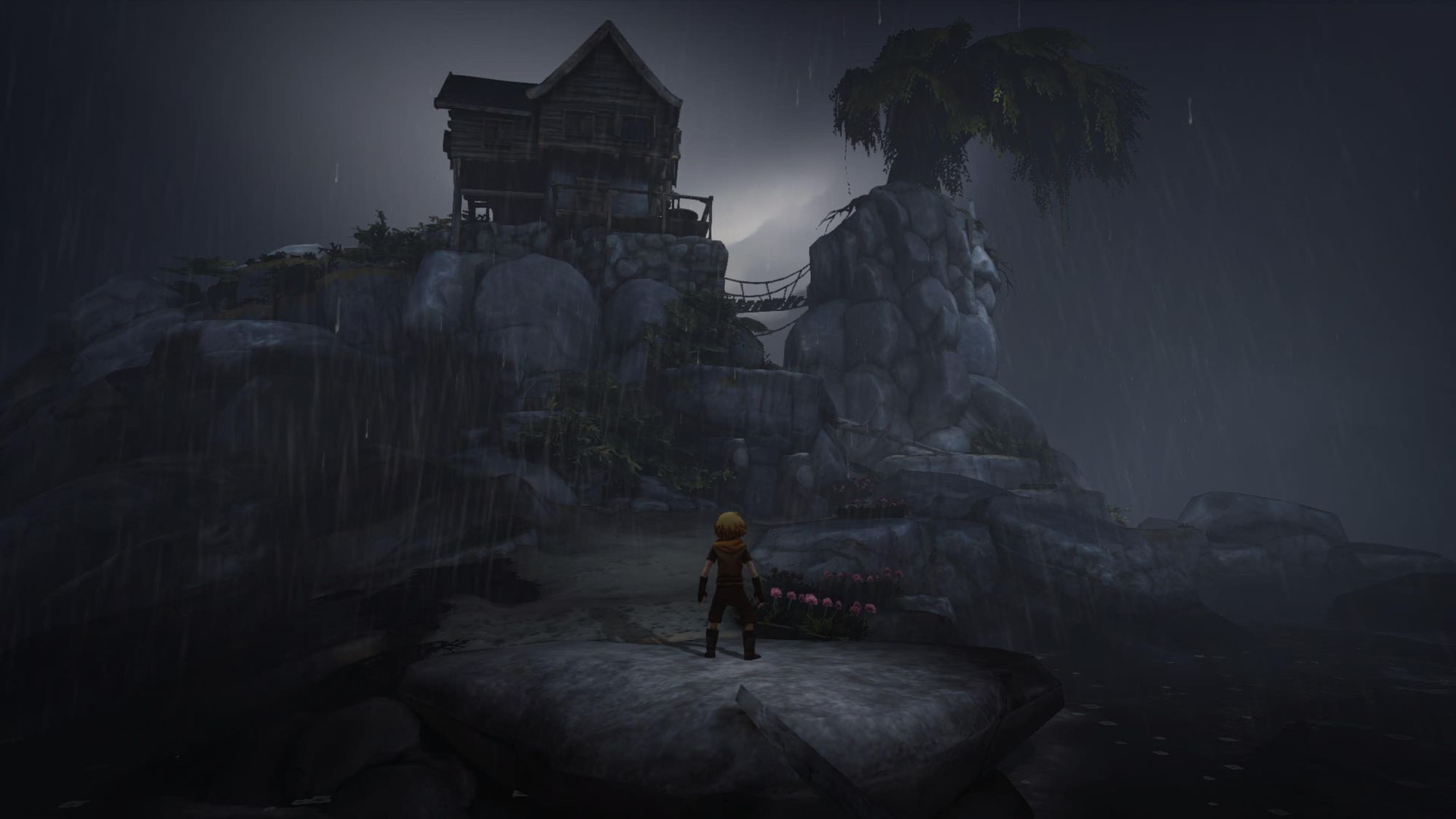 The little brother arrives back home, where the story began, his and the doctor's house, where his father rests, is above him on a towering cliff. A storm rages in the night, his idyllic home now a place of darkness, and the boy looks so small in the face of it all. With the cure in hand, he makes his way forward.
