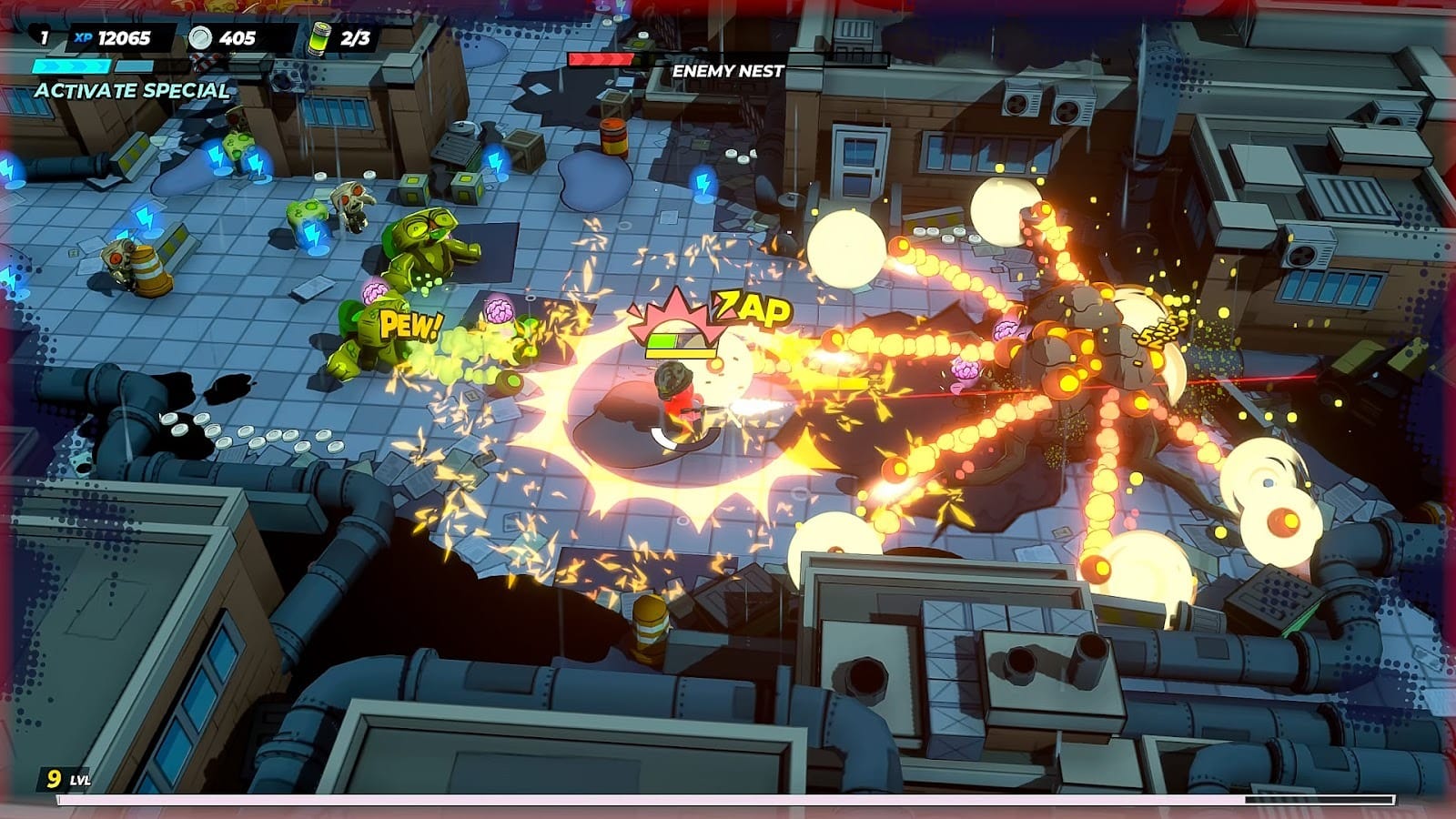 The moment-to-moment action is properly frantic. Exploding barrels are everywhere, slobbering hordes pile in from all sides, mini-bosses crash the party, and there are crates galore begging to be blasted into smithereens. Every crate has loot inside, too, which makes it doubly satisfying. There’s also a co-op mode, which looks like the ideal way to play, but my partner hates twin-stick games, so I’m running solo, which is fine with me; I'm having a blast nonetheless!