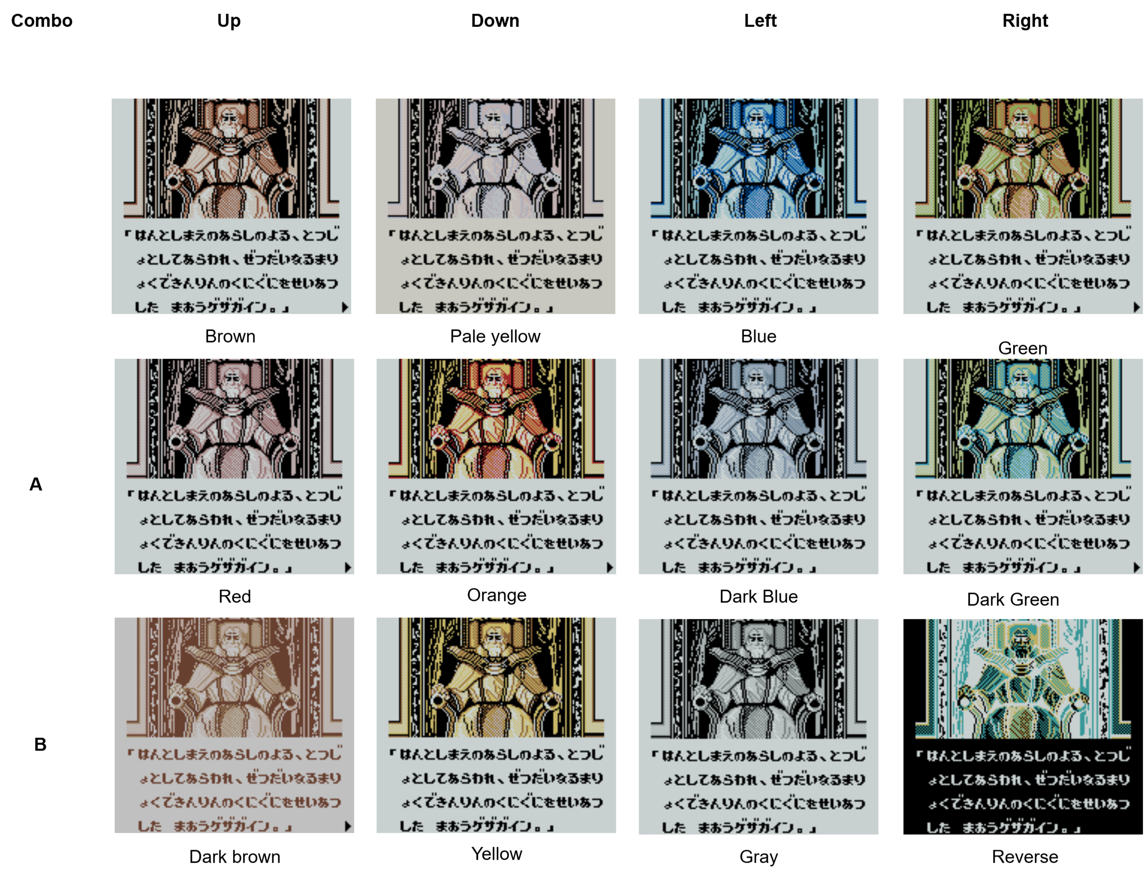 For GBC-exclusive games, the hardware supports a 15-bit RGB palette, but color usage is strictly palette-based: each background tile references a 4-color palette, with up to 8 background palettes and 8 sprite palettes available per frame. For sprites, one color is always transparent, resulting in a practical maximum of 56 on-screen colors (32 from backgrounds and 24 from sprites). When running original Game Boy games, the four grayscale tones of the monochrome game are mapped to predefined color palettes, either automatically selected based on the cartridge header or manually chosen by the player via button combinations at boot, preserving the original light–dark relationships while adding hue.
