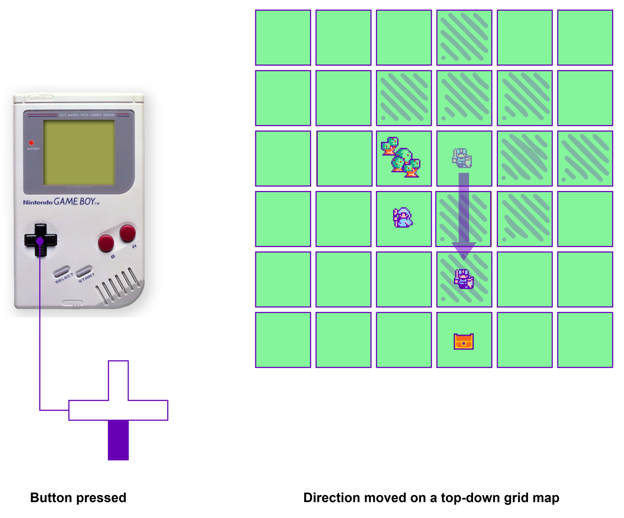 Despite their severe technical limitations, the Game Boy models offered a basic ground for tactical role-playing games. Their low-resolution grid-based displays, turn-based input model, and modest processing capabilities aligned with the requirements of small-scale tactical gameplay. Tactical RPGs developed for these handhelds often featured concise and episodic narratives, succinct dialogue, few simultaneous units, discreet movement with few variations, small top-down grid-based environments lacking verticality, few objects, menu-driven combat, and interfaces that simplified and sometimes omitted specific information (such as the chance to dodge or block an attack). Furthermore, the portable format encouraged short and intermittent gaming sessions. The Game Boy's D-pad is ideal for top-down grid movement, and the A / B buttons on this handheld are used to select a playable unit and its turn-based action.