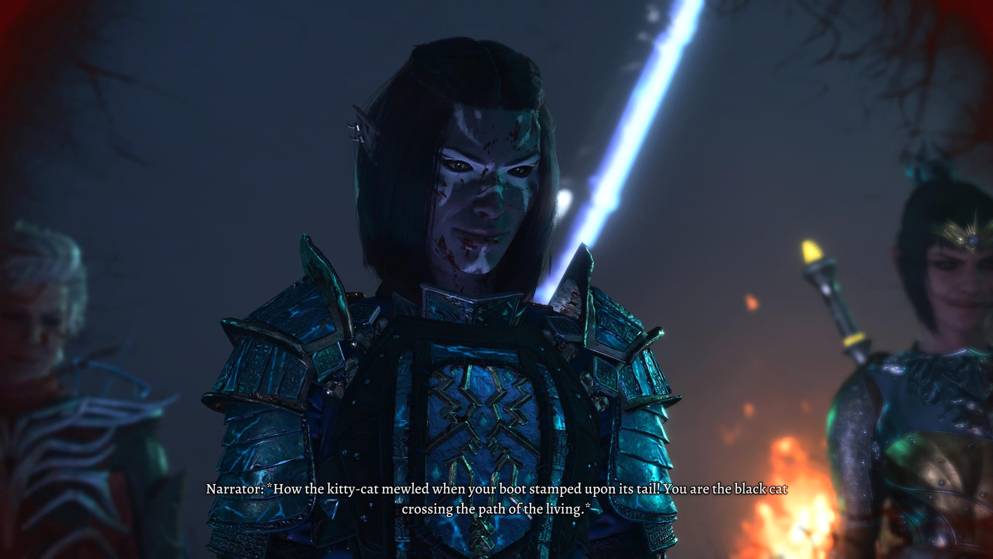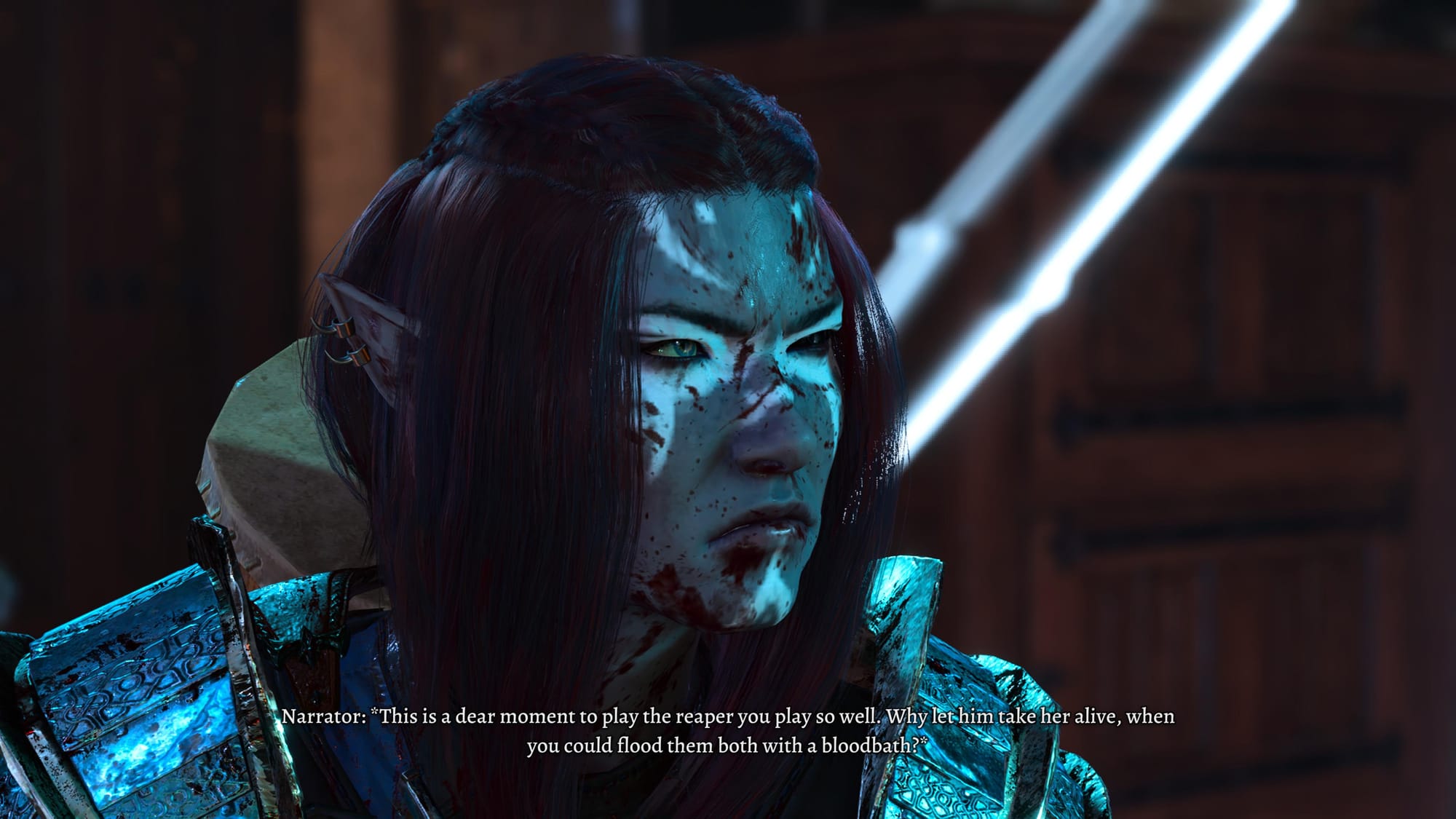 Another BG3 example: In the beginning of Act 1, you can find a magic portal with a hand sticking out of it, and a voice calling out from the portal for help. Grasping the hand and pulling hard enough allows you to meet Gale, the affable wizard companion. But as the Dark Urge, you can choose to fantasize about cutting off the hand, and then the screen turns to black… and yep. You chop off his hand. Gale is gone, never to be a companion. NOPE NOPE NOPE. Reload. Astoundingly evil moment, yes, but it didn’t fit the story I was trying to tell. It was too early to take the dark plunge per my plan.