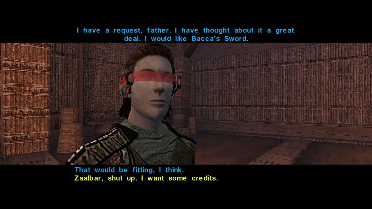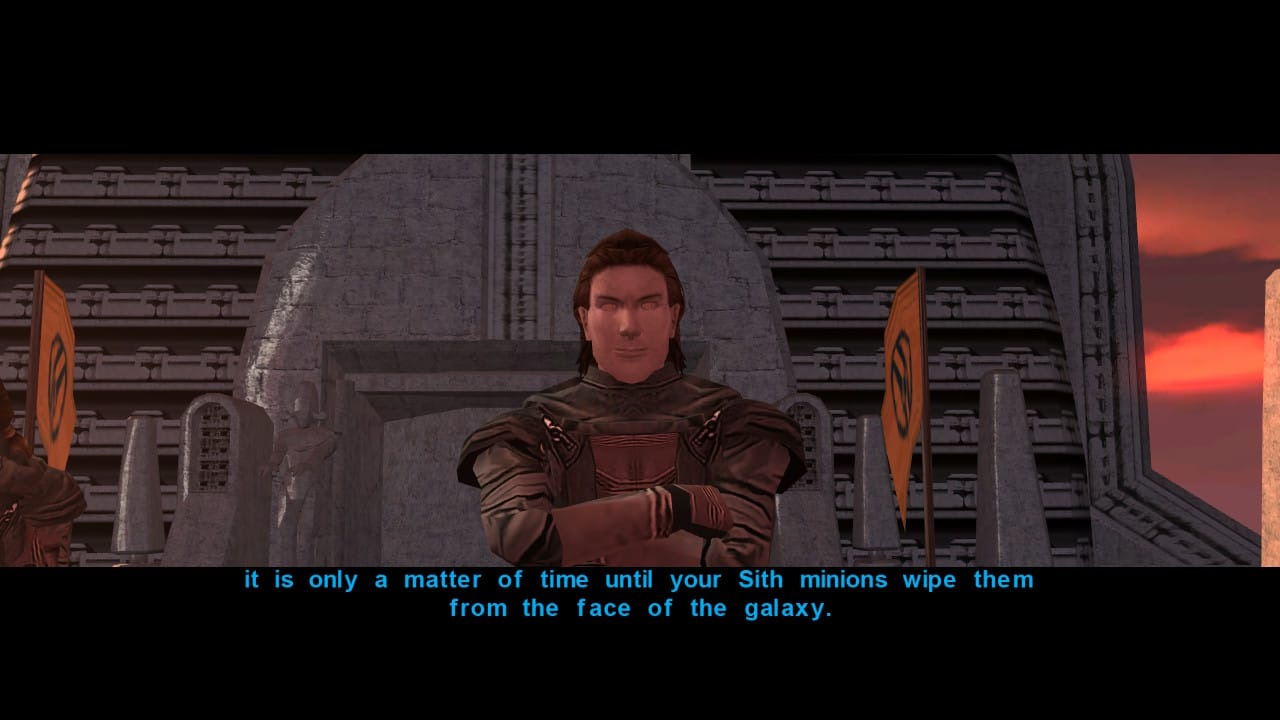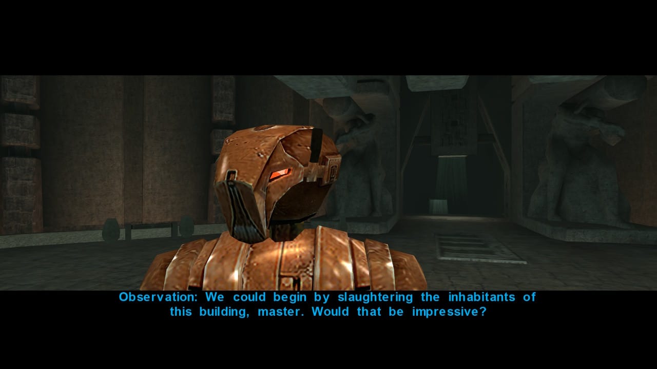 Provide an avenue for your anger – I found it weirdly therapeutic to do an evil playthrough when I was in a rough spot personally and harboring a lot of pent-up anger. In the months leading up to my wedding, my now-wife and I experienced an extremely close death in my family, chronic illness, and a very unhealthy living situation. Sometimes it feels like life is a shit cannon and you’re the target. Even with therapy, it can be hard to process all the anger and negative emotions, especially when it’s piled on so high. During this time, I did my Sith playthrough in KOTOR 1, and honestly found it helped me. It felt sort of like listening to really angry or intense music when in a bad mood – it provided an avenue for these emotions to flow through and out of me.