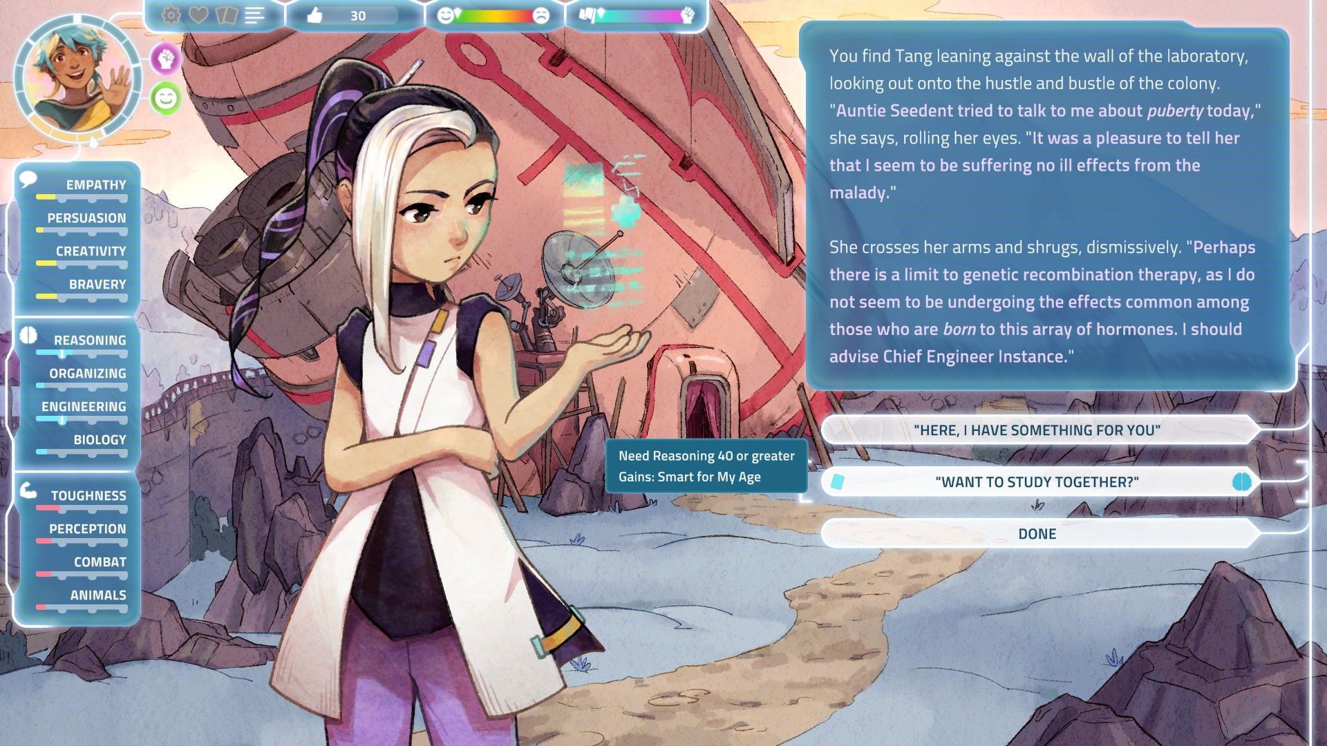I think that Persona has a perfect formula for the "time manager" concept; it's a game that takes place over a year and contains the external character motivation to facilitate the panic of not being able to complete everything in time. I Was A Teenage Exocolonist brilliantly adapts this outline into a game that tells you that you have ten years and you won’t get to do everything, and that’s okay. There is also less pressure when thinking about replaying I Was A Teenage Exocolonist to optimize time a bit better as the game is only ten hours in contrast to Persona 5’s one hundred hour time commitment.
