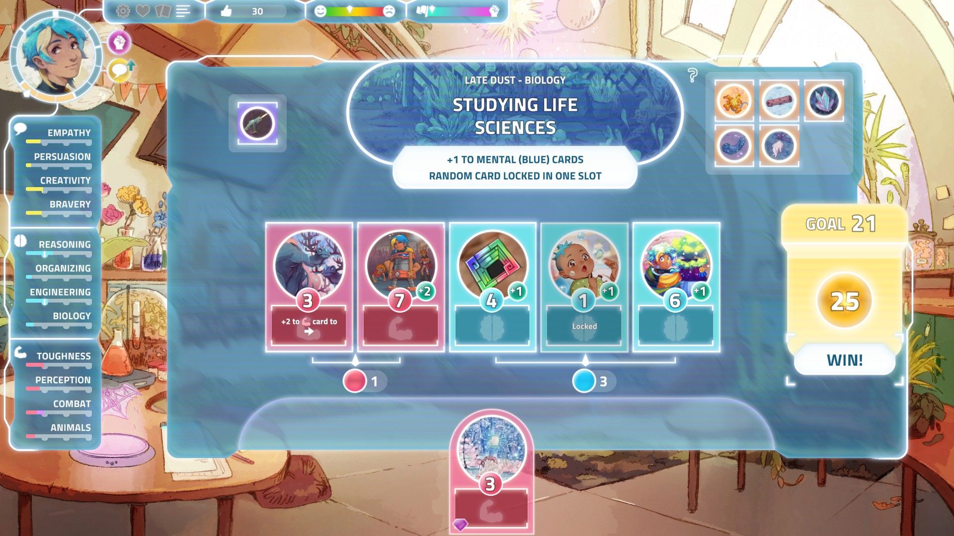 The first being that this game takes place over ten years rather than Persona’s single year. This is important because it changes the dynamic of all the characters as people grow and change, allowing the writers to tell a much more harrowing and insightful tale of youth rather than detail the day to day urges and emotions of the teenager as is on display in Persona. The second and more differentiating thing that grounds I Was A Teenage Exocolonist in its original setting is its stress system. While doing your activities each year you will have to take around one or two months to relax, you don’t get any stats from doing this although you do have the option to cut cards from your deck. This is in stark contrast from Persona’s “make every day count” mentality. It makes you take a step back and remember those words from the tutorial that assured you that you won’t have time to do everything, so make sure to take your breaks.