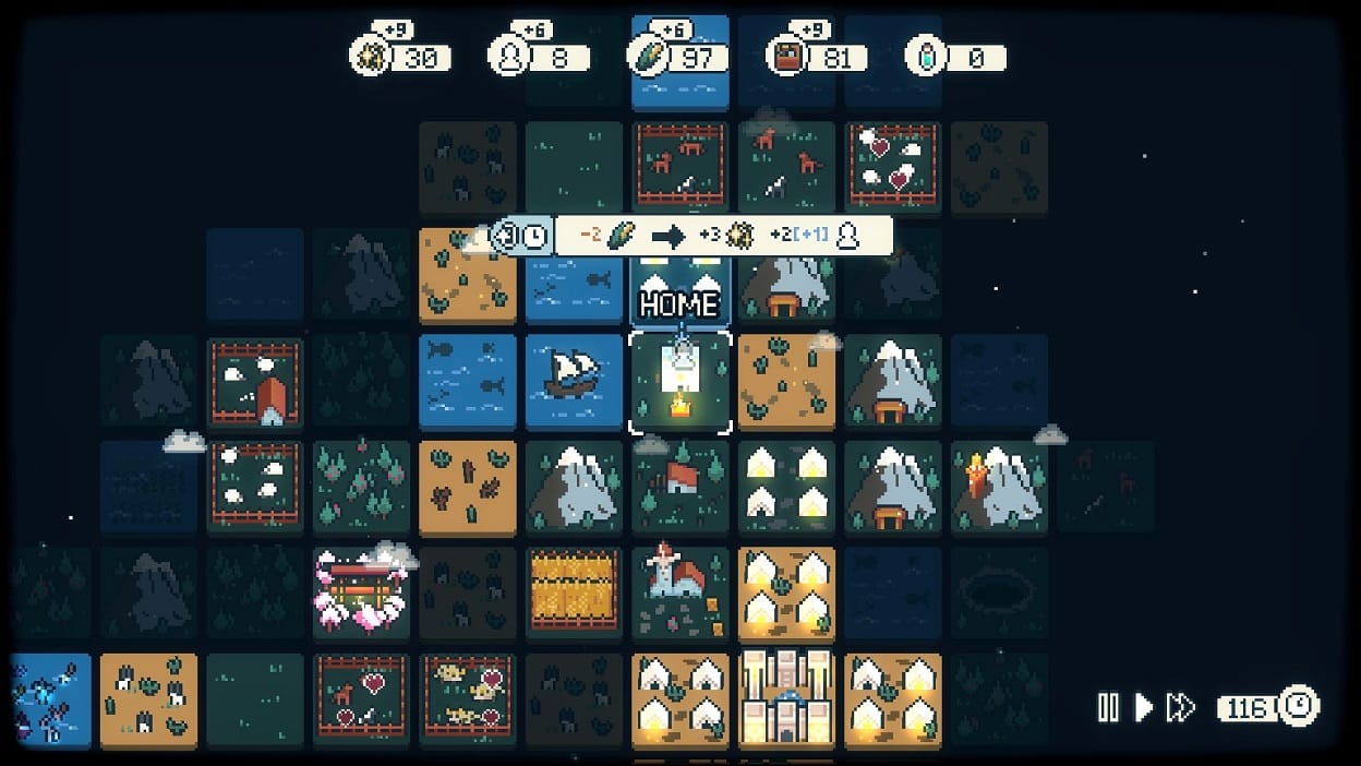 At heart, Dawnfolk is a game about managing resources. Buildings produce and consume four major resources based on their positioning. Most buildings have an adjacency bonus based on either other buildings or terrain types - haphazardly plopping buildings anywhere is likely to yield inadequate results. There are also one-time opportunities to gain resources by gathering them from certain tiles, with the player gaining bonuses by doing well in simple minigames.
