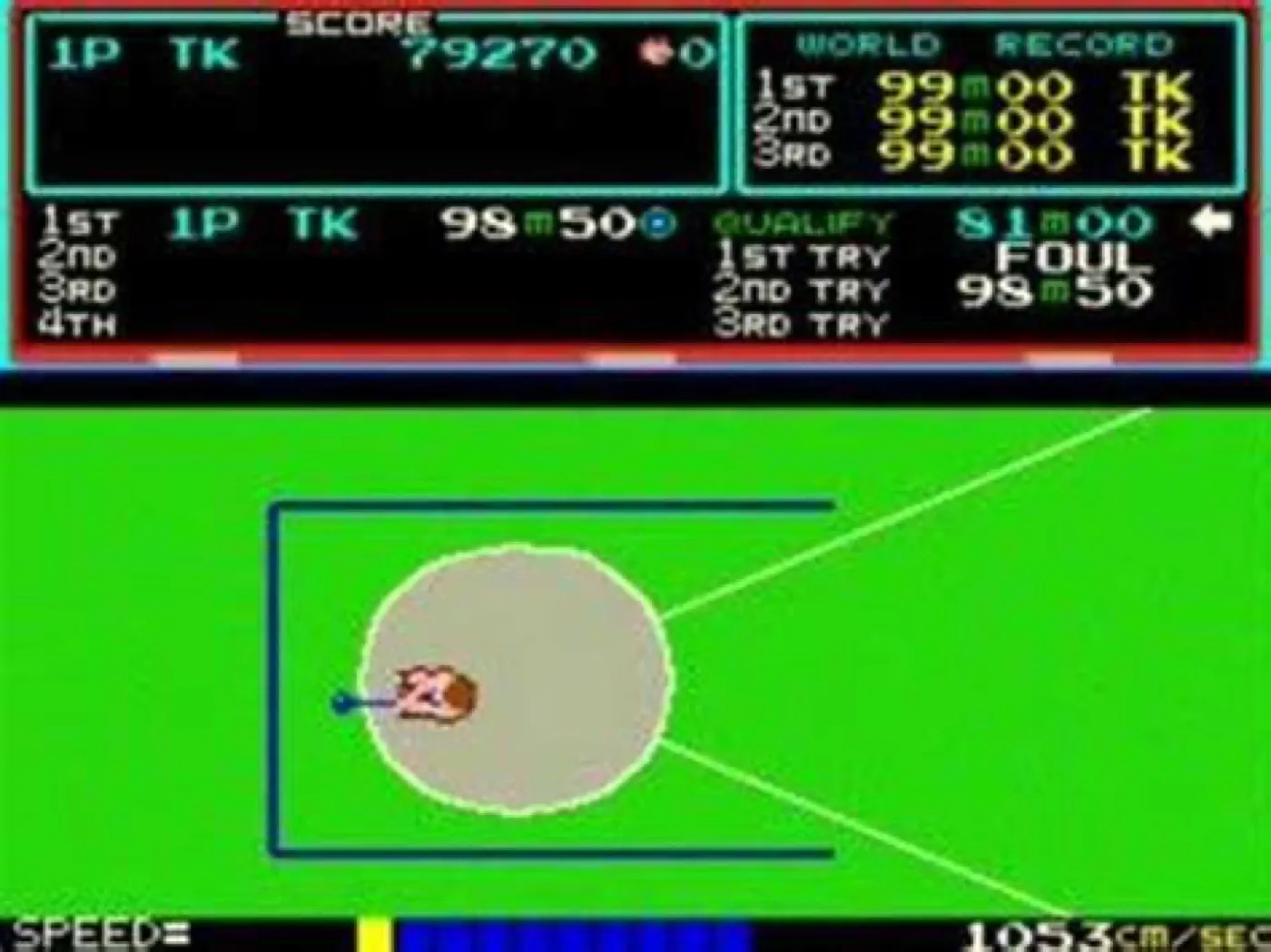 Once you got to play the game, you understood why those previous players would work the speed buttons so intently. In order to succeed at any of the six Olympic events the game had to offer, you had to do two things: you had to generate enough speed and maintain it all the way up until you hit the Jump/Throw button above, and you had to hit that top button at the right time. If you were too early you weren’t gonna make it.