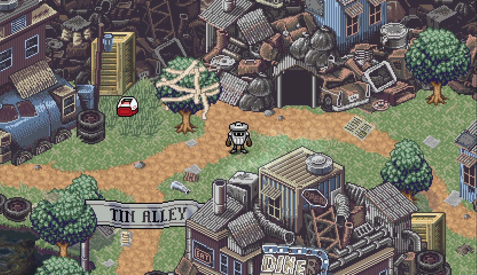 Unrestricted, Kingdoms of the Dump knows what to pick from its dumpster diving. It incorporates many fan-favourite elements of JRPGs and combines them in one package. It's narrative-based, featuring turn-based combat with tile effects and timed hits. Field exploration features jumping and climbing, adding layers to exploration and moving around hazards and enemies. Players can quickly toggle between the characters on the field to use their unique abilities, like scraping junk and metal enemies as Dustin, shooting as Walker, and climbing ropes as Ratavia. Lastly, there is a large Mode-7-inspired world map to explore by land, sea, and air.