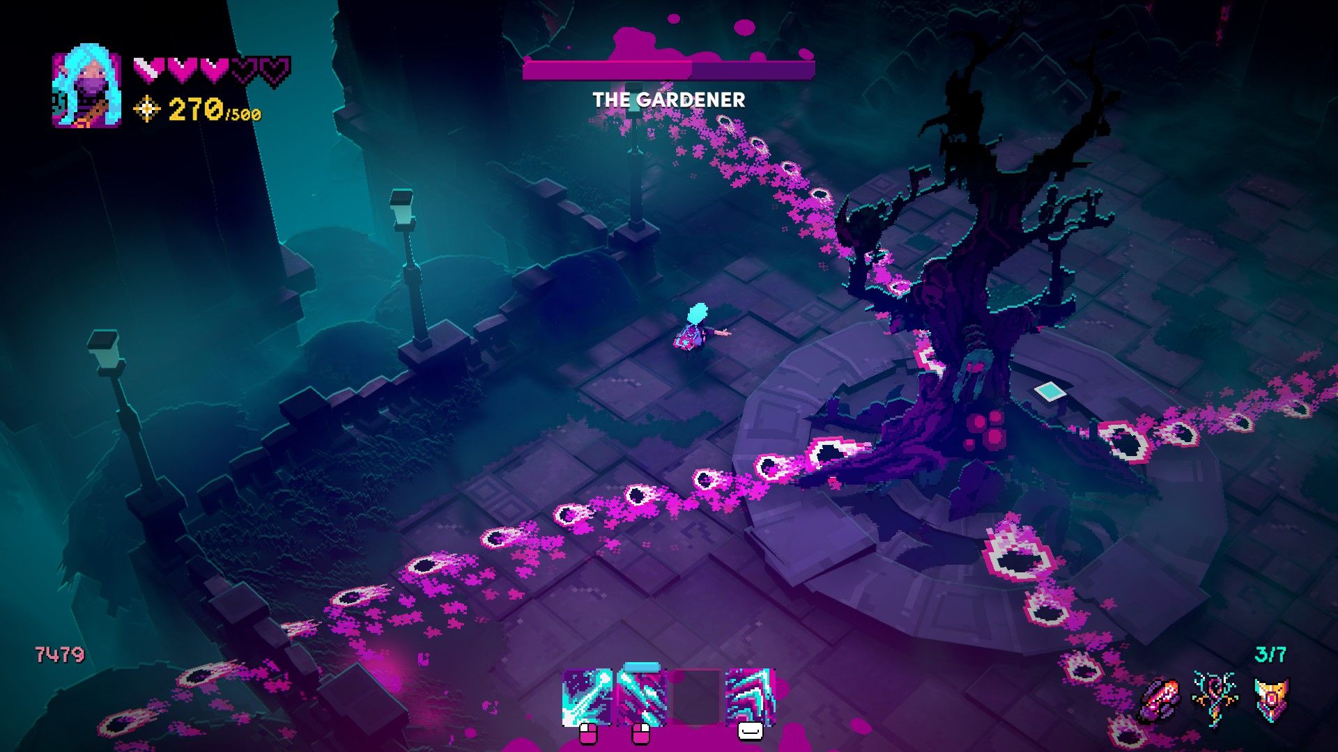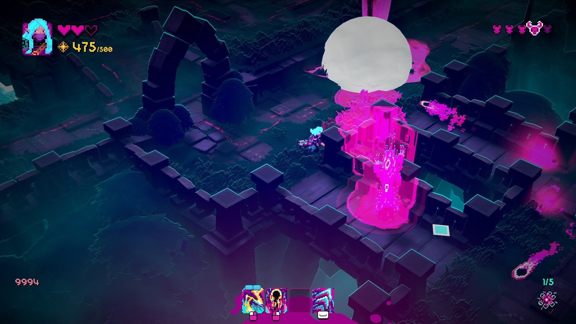 Magic doesn't just play into the story - it's baked into the gameplay as well. The player has four slots for spells, of which two are filled at the start of each run: A genre standard evasion move and the player's choice of eight offensive spells, ranging from a short-range projectile burst to a rail gun-like charge blast. There are many additional offensive and support spells, and all of them can be upgraded.
