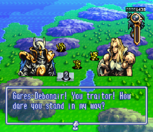 In addition to the KSK games, I can't forget to mention Ogre Battle: The March of the Black Queen (1993), written and directed by Yasumi Matsuno. Ogre Battle, at the beginning of the 16-bit era, was not only a real-time SRPG with a major popular success (over 400,000 units sold), but also with influential innovations for SRPGs in general.