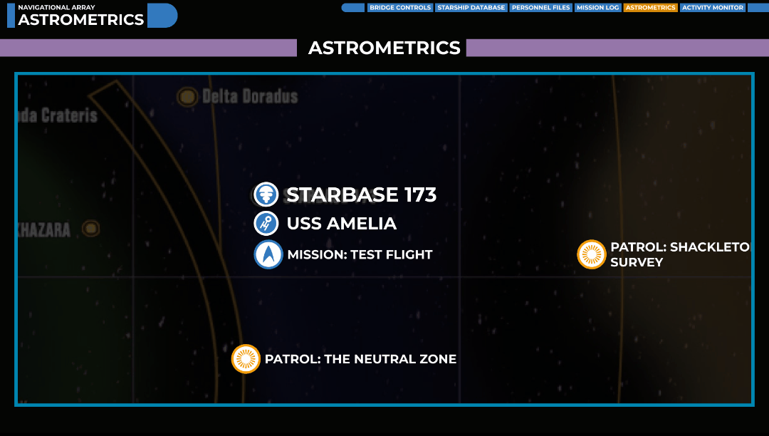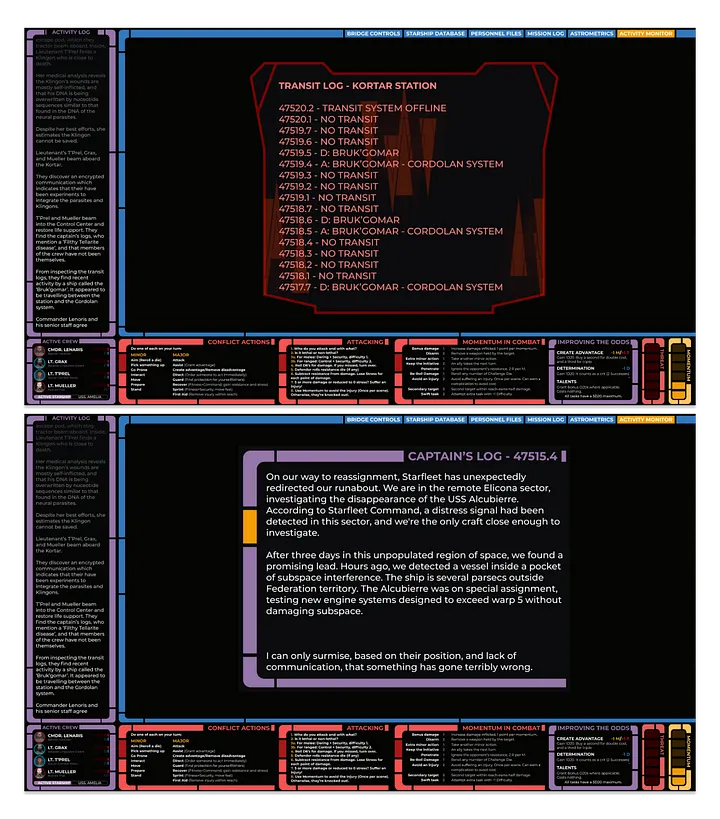I also wanted to do this for our Star Trek Adventures game, but in a way that felt congruent for the universe. For that reason, I decided to expand the prototype into a computer-like terminal with tabs for different information.