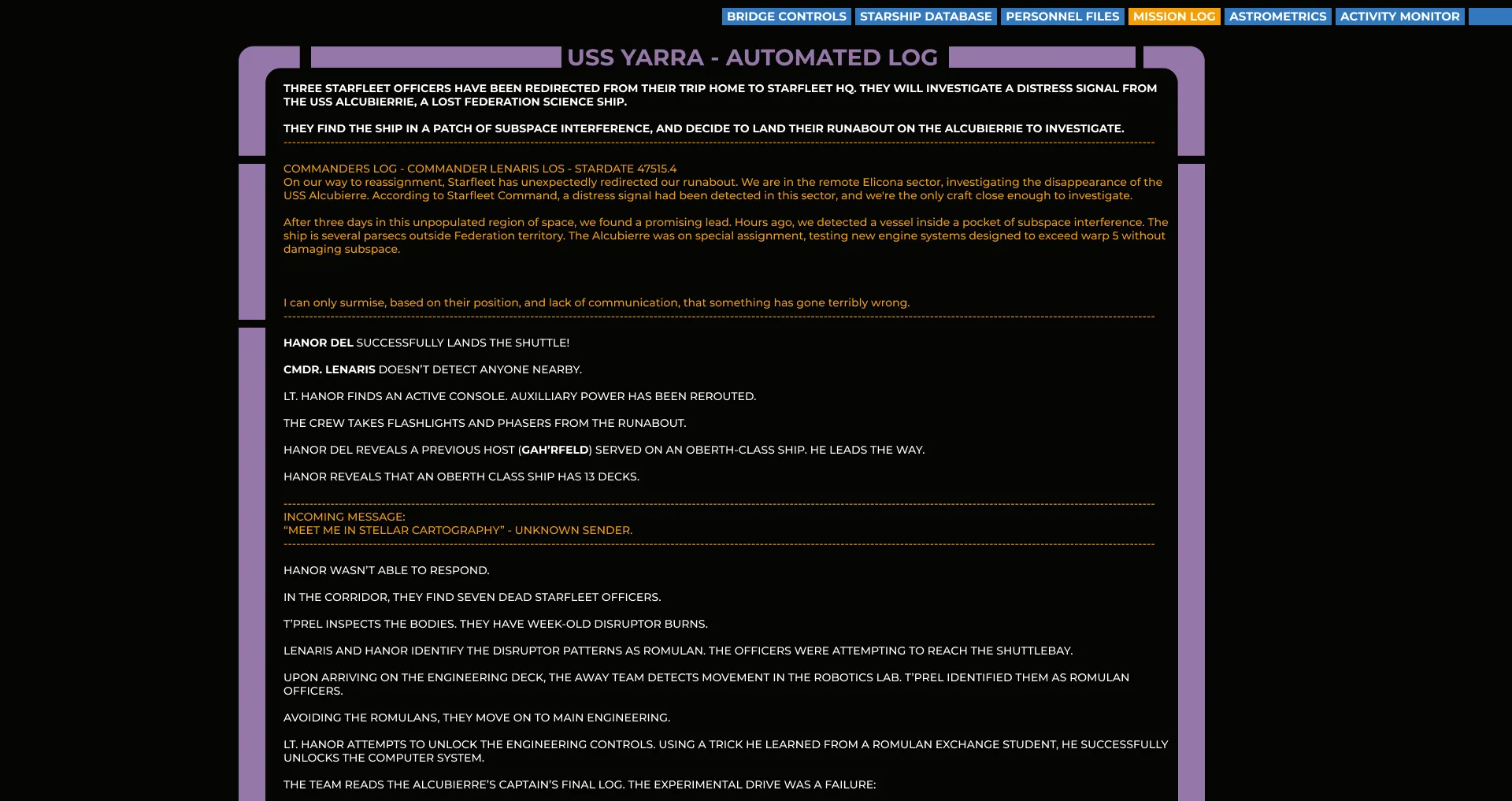 As I was keeping a live feed of the story going during our gameplay sessions, I simply copy and pasted that feed into a mission log at the end of each game. This became an easy, scrollable history of what had happened.