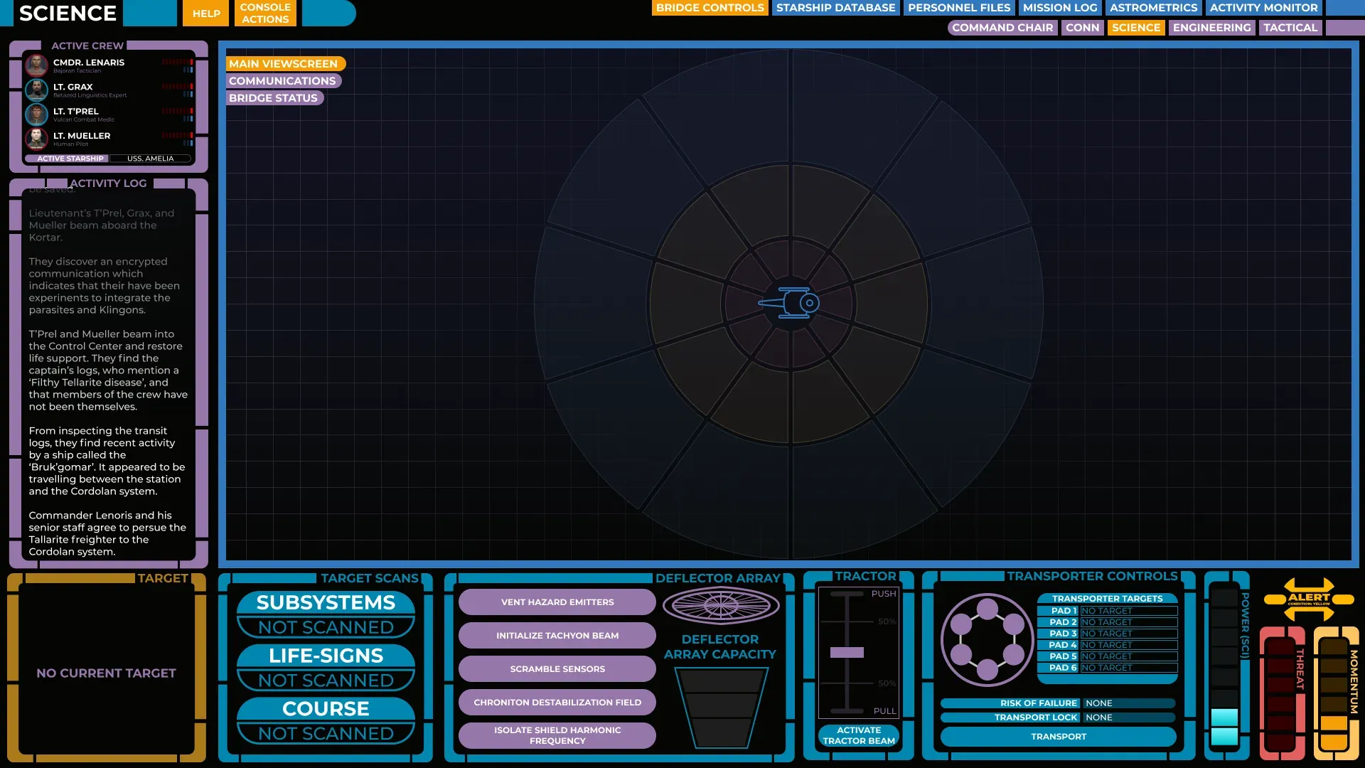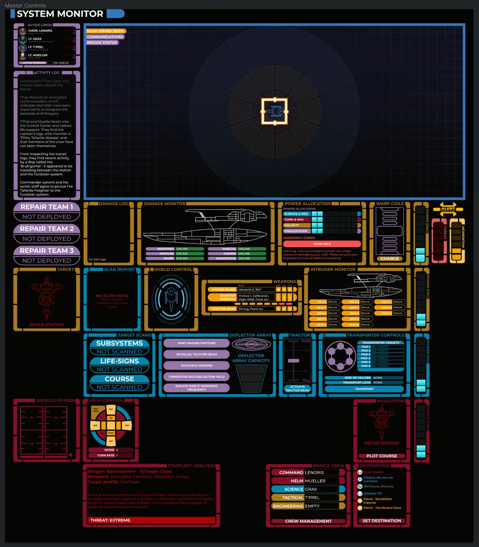 Some panels, such as targeting or power management, were shared across multiple stations. To solve this, I kept a master component on a secret screen that only I could access and updated it when applicable. This way, the child components at each station remained synced. This also worked for the viewscreen.