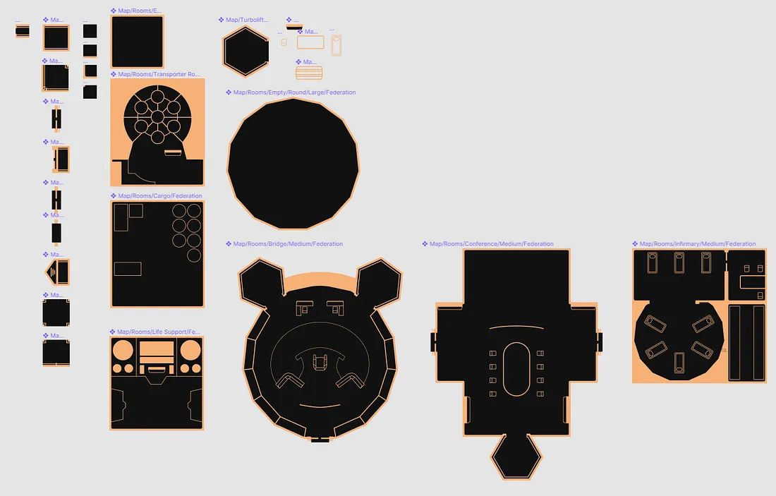 Most of these map components actually use Figma’s auto-layout, so I don’t have to place hundreds of tiles — I can stretch out a corridor to be wider or longer, or adjust the size of a room and have the furniture stay in the right space. It made it really easy to generate quick maps. For more important or complex spaces, I created bespoke layouts but kept all the fixtures and furniture as separate components, so they became reusable in later maps.
