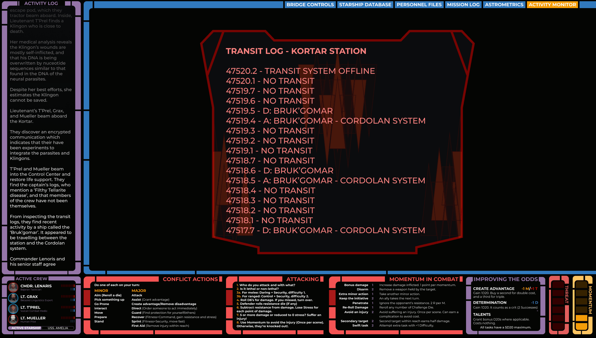 One small note — keen-eyed Star Trek Adventures fans will notice that we didn’t use the full STA rules for our starship combat. Because of the enhanced capability of having a UI like this, I created a set of homebrew rules that took advantage of how we were playing. I still think STA’s ship combat is a blast, though!