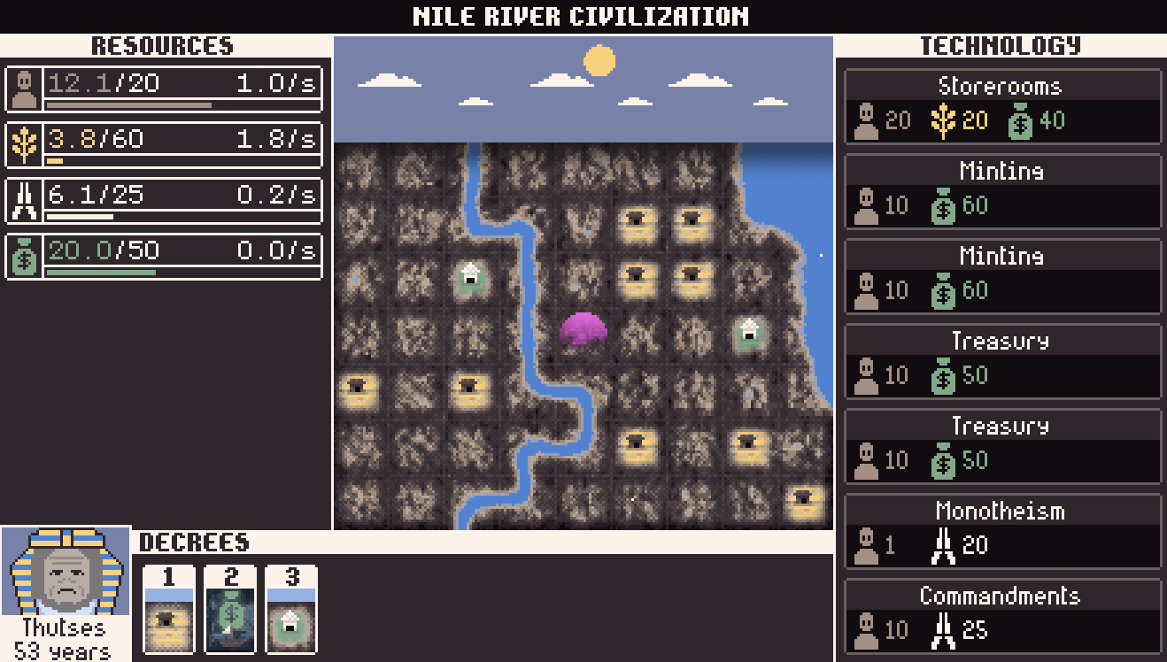 Boba is the Compo winner. It's a resource management game where you have to balance an increasing number of resources to create an ancient civilization. This primary gameplay loop would be a very good game jam submission already, but once you beat the first stage, the game opens up more regions and eventually expands beyond the limits of the Earth itself.