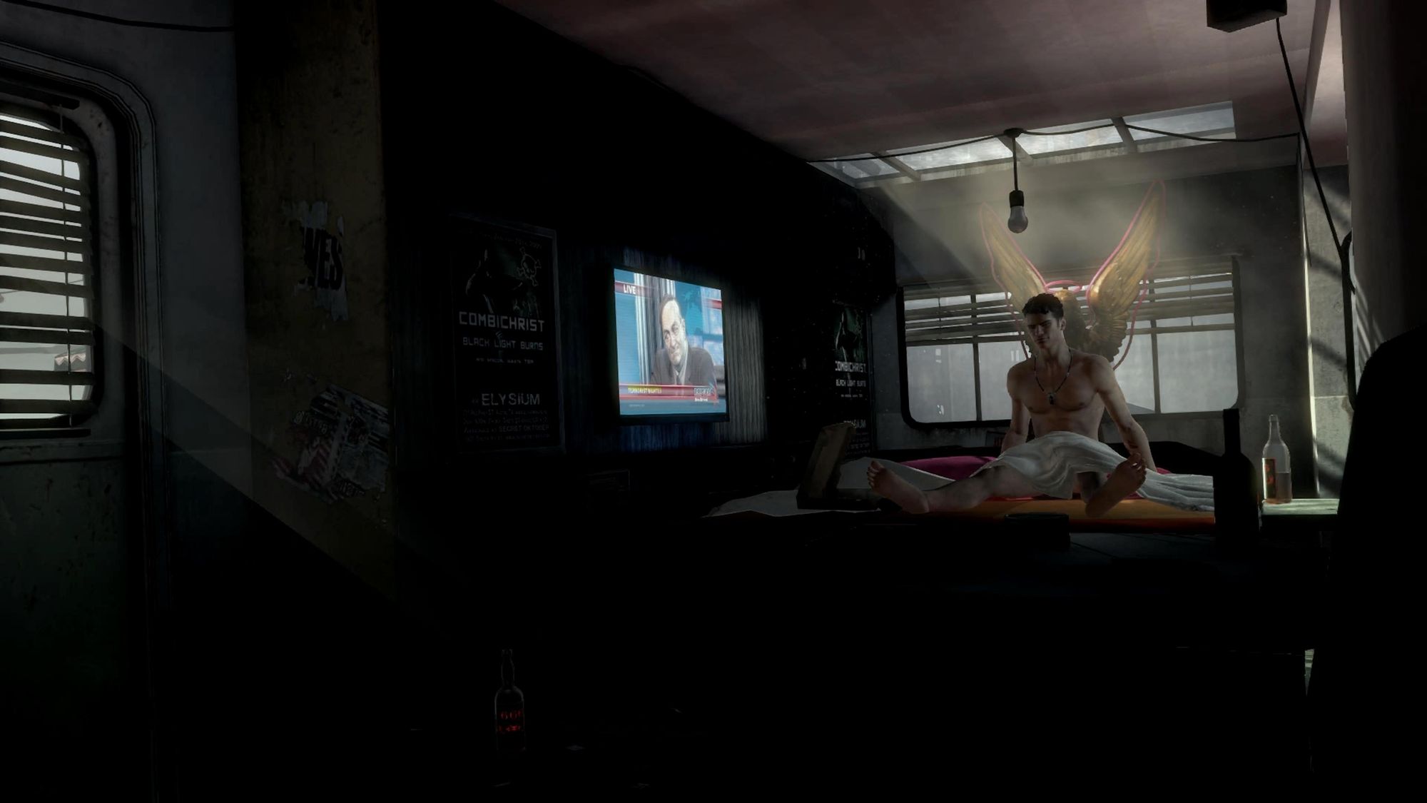 Contrasting starkly with the Devil May Cry shop fans know and love and the earlier scene, this trailer exudes a sense of instability. All that stands out amongst the mess of bottles is a flickering TV screen featuring a news station reminiscent of Fox News and a golden-esque angelic statue. As Dante sits up, the statue’s wings appear to flare from his shoulders, catching the daylight streaming in from a nearby window, as if challenging the trailer’s inner darkness. Not all is lost despite Dante’s show of nihilism.