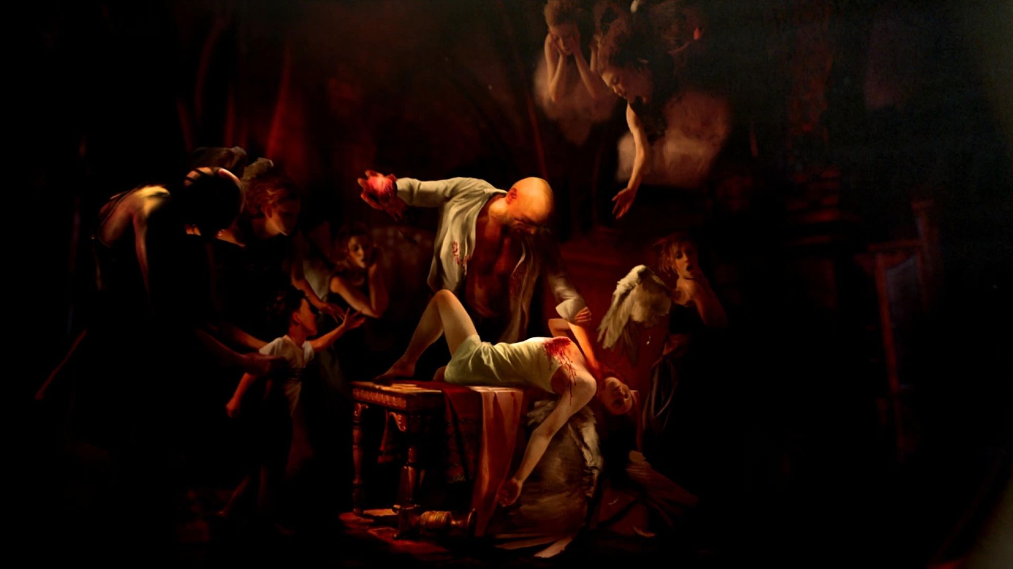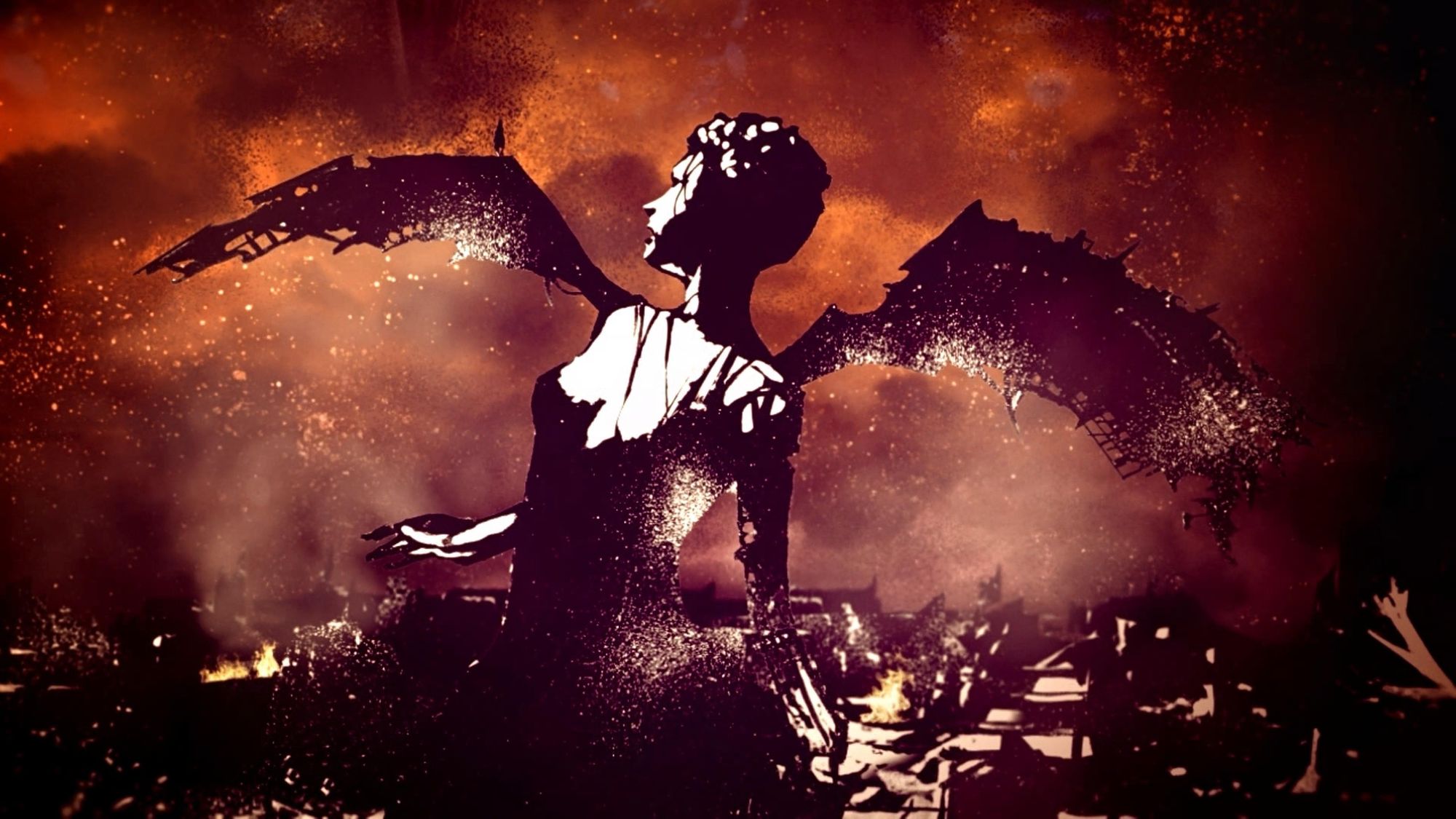 Hugging the corner of a building, an angelic figure chiseled from stone curls, its features clinging to the solid surface, head buried in the crook of its arm. However, the camera resists lingering on this celestial being, as the sprawling metropolis and towering buildings effortlessly demand and win its attention. Instead, the camera ventures into one of the massive structures, revealing a well-dressed man nonchalantly threatening the president over the phone. Amidst opulence, surveillance, and icy minimalism in shades of gray, a wall of screens flickers with live feeds of the city and Virility’s stock market growth. The only source of warmth in this otherwise chilled space is the captivating Hell Gate on display. Framed like a striking piece of art, it swirls and breathes in an array of red hues.