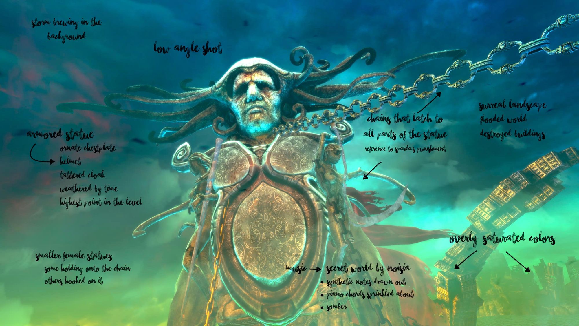 Great chains encircle the statue’s neck, wrists, and torso, some tethered to floating buildings, others to pillars rising from a submerged landscape. This over-saturated world quietly reveals itself as a somber prison, resembling a flooded graveyard of buildings. Further heightening this eerie ambiance is Noisia’s ‘Secret World’ playing in the background, featuring drawn-out synthetic thumps mixed with nostalgic piano keys. This is a place that houses endings…but today, it will serve as the beginning of Dante’s journey.