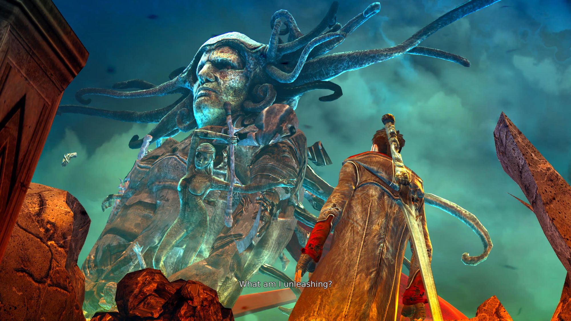 What I immediately love about this imagery is its direct nod to Sparda, even though Dante and the audience remain unaware at this point of Sparda’s fate. As the game unfolds, do we finally receive a glimpse of Sparda’s punishment by Mundus’ hands — bound by chains, condemned to eternal imprisonment in Hell. Although the statue portrays Sparda in impressive armor, the passage of time has taken its toll, leaving behind greenish-blue and yellow splotches from the corrosive water in this mindscape. These colors unflatteringly dig into the flesh of the statue, deepening frown lines and hollowing out sockets. A clever reflection of Sparda's absence, both physically and mentally, in the lives of his children.