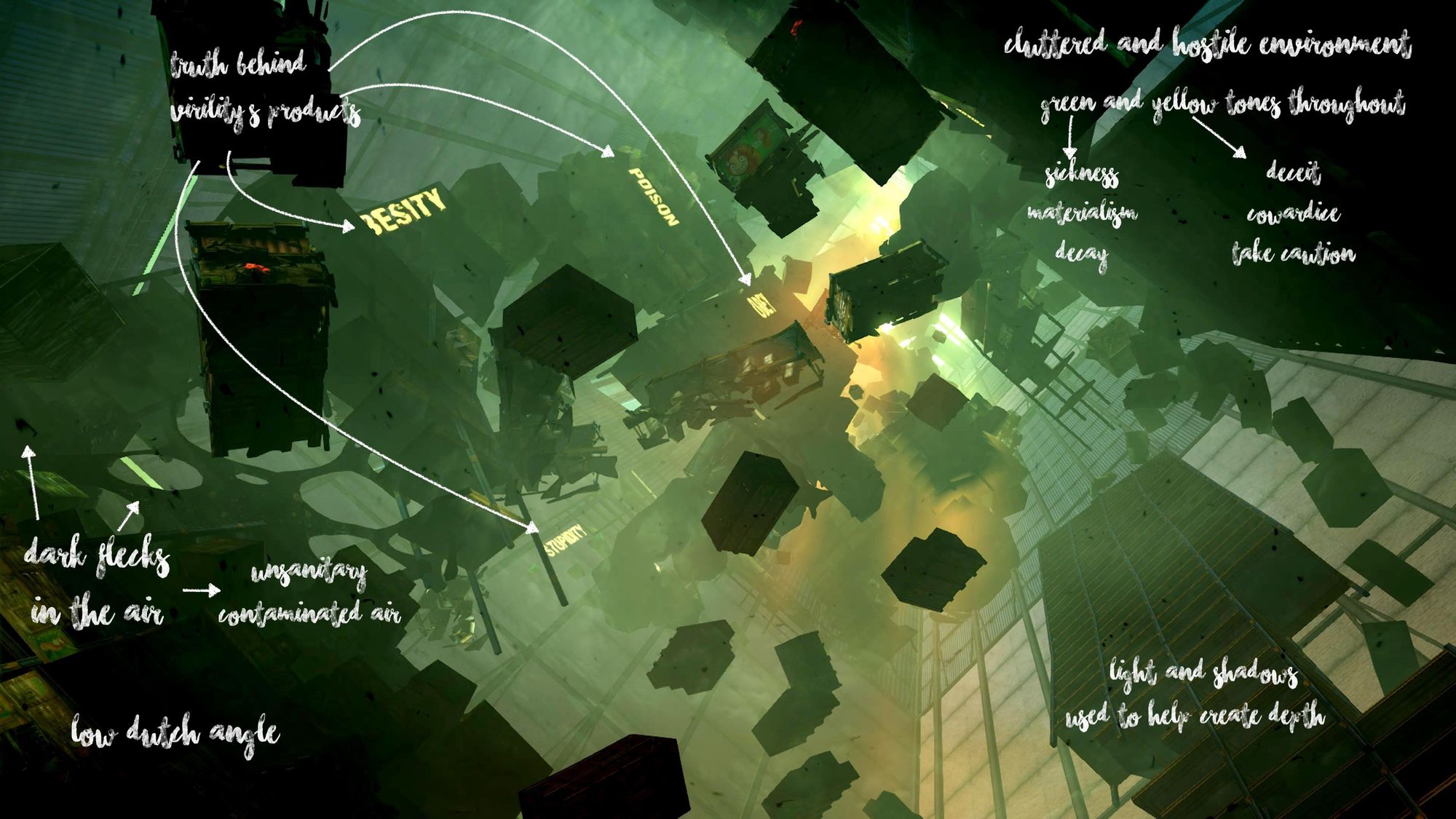 The camera settles into a low Dutch angle, stressing the unsettling nature of the world. A greenish haze envelops the factory, punctuated by sporadic patches of yellow towards the top. The rushing wind that comes from below brings dark flecks, making the space feel stifling. Virility factory exudes a sickness, heightened by the wavering words “OBESITY” and “POISON.” Even the illuminated letters crawl with dark veins, pumping a glowing substance that squelches and drips through the speakers—a subtle reminder of the psychotropic poison in the Virility drinks that affects the human populace.