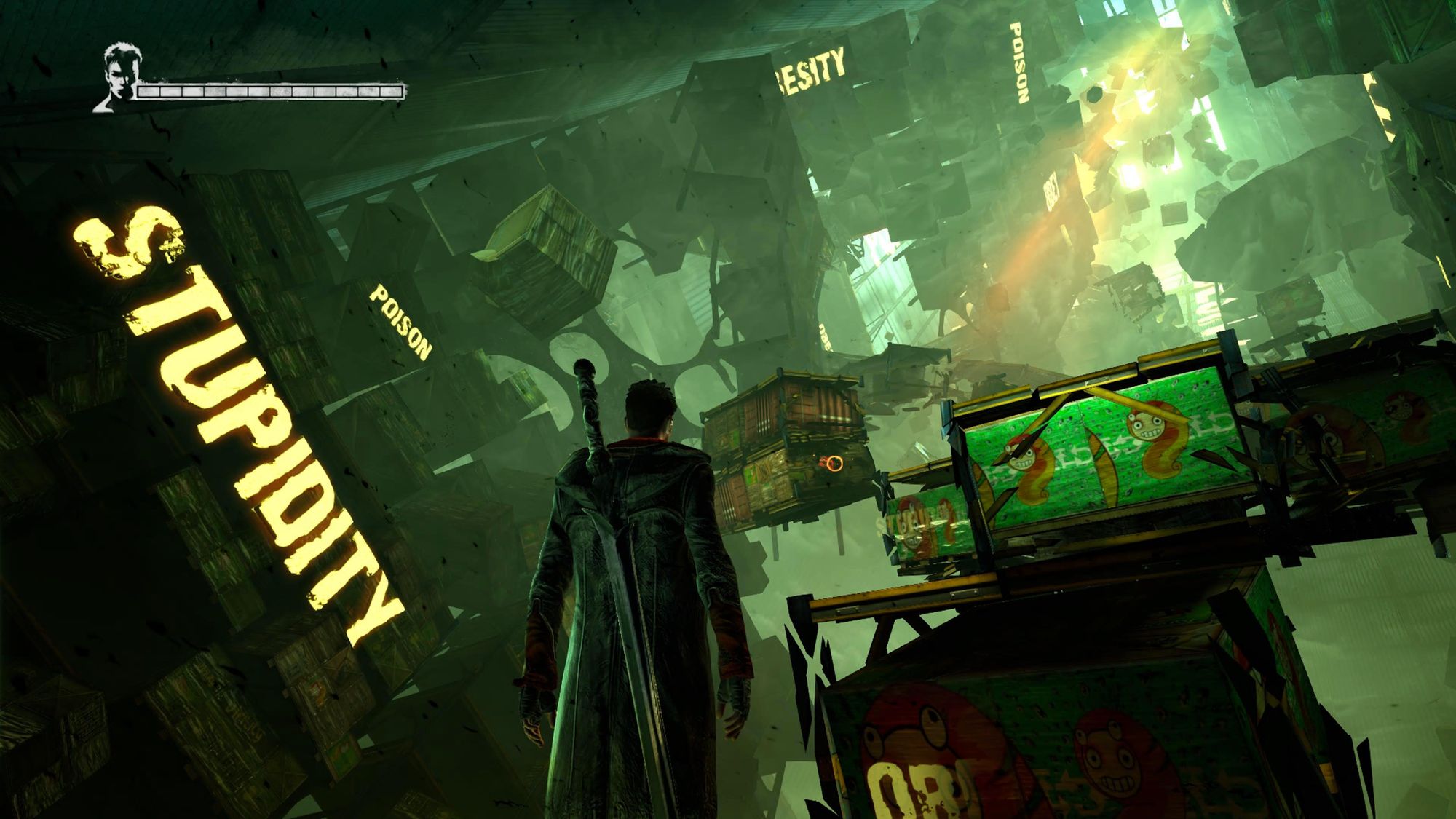 What I truly adore about the DmC reboot is how unforgiving the locations can be for Dante. There are no clear paths here. Some shipping containers tremble and waver, as if part of a mirage, adding to the inhospitable environment. Others rise and erode out of existence. When Date finally finds a long stretch of solid ground, crates will instantaneously stack atop each other, encasing Dante within as demons pour out. The factory will do everything it can to keep Dante in this metallic pit.