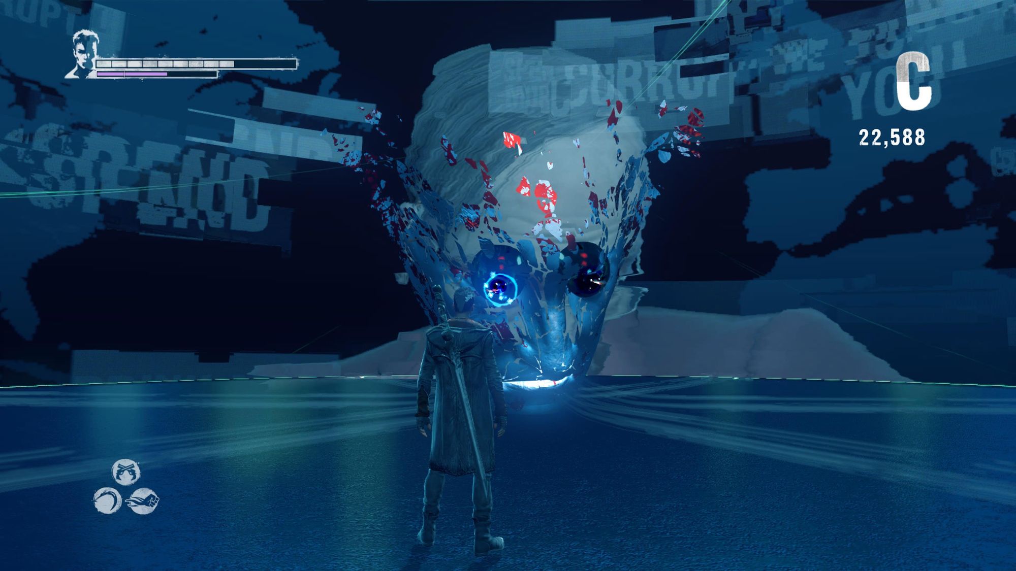 Barbas will hurl pixelated rays of energy at Dante, prompting Dante to disable his power sources. Once shut down, Barbas' image splits – he's a poorly rendered photo with eyes hollowed out and features glitching. It's incredibly satisfying pummeling his digitized head when in this paralyzed state.