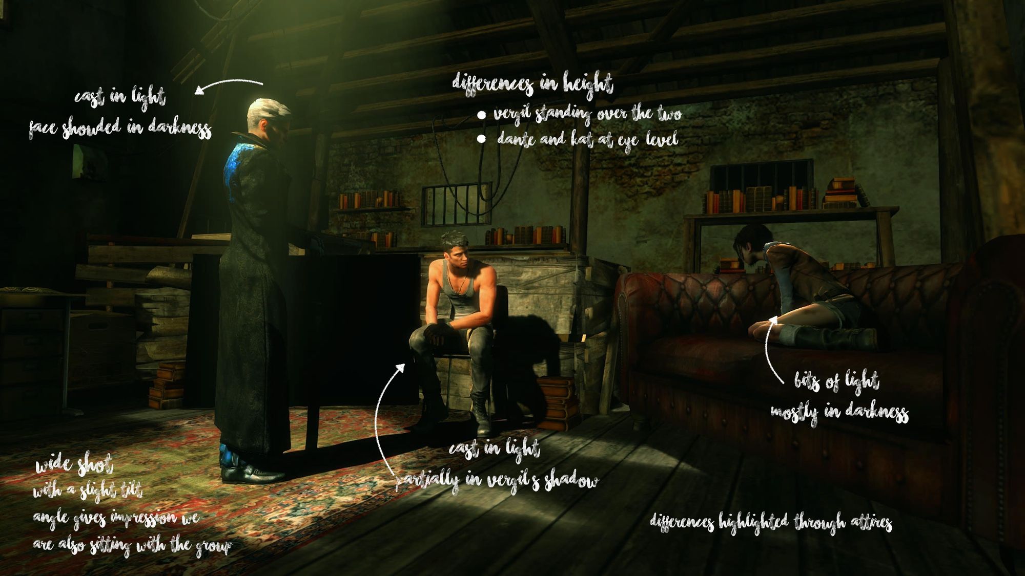 On the note of differences in height, the camera positions Kat and Dante at eye level, demonstrating their mutual respect and equal footing in their relationship. Meanwhile, Vergil stands above them, looking down, subtly suggesting his sense of superiority over both, despite his affection for Dante.