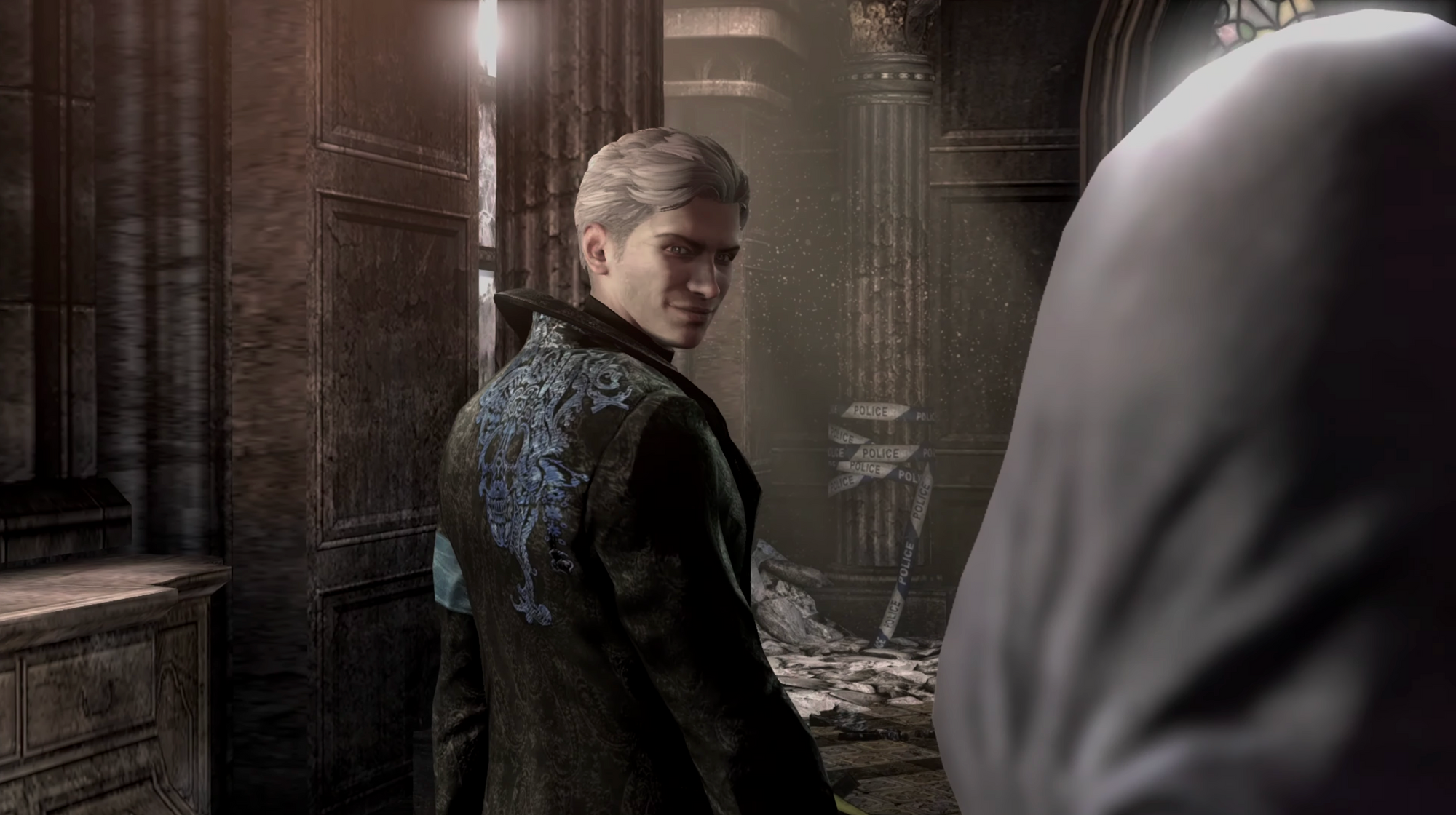 This brings us to the shot that was introduced earlier, a wide shot of our three protagonists in a dusty safe house, nursing their wounds after Mundus’ recent attack on the city. The camera positions us as observers as if we are sitting on a chair just out of frame. Amongst us all, Vergil stands tall, bathed in natural light that highlights the blue embroidery on his jacket — a flash of color existing in an otherwise dull environment. This use of lighting and blocking exudes Vergil in control — confident even after the chaos his actions caused just moments ago. He stands in a position where he is needed by the two of them.