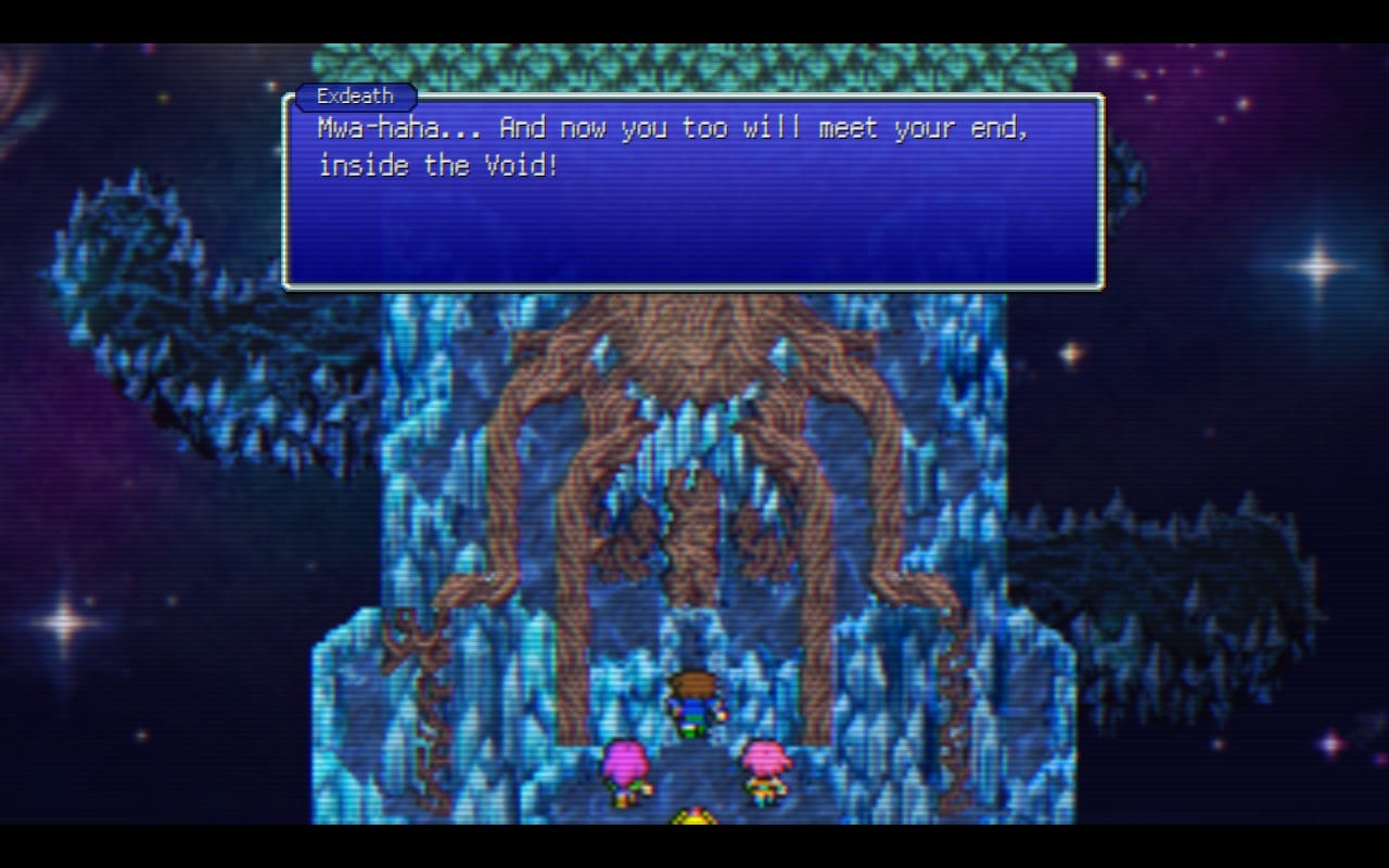 I fought Neo-Exdeath exactly once when I realized that I didn’t have the tools to defeat him. I spent the entire game skipping summons and ignoring pianos and blue mage spells. I could have made it work. I could have ground out the gil to buy my way through with a few well-placed Zeninages, but I didn’t. Just like the grand finale to my elementary school stage performance, I couldn’t finish knowing that I had missed all of what makes this game a masterpiece. My final save file contains Bartz staring right at the tree in the final boss room.