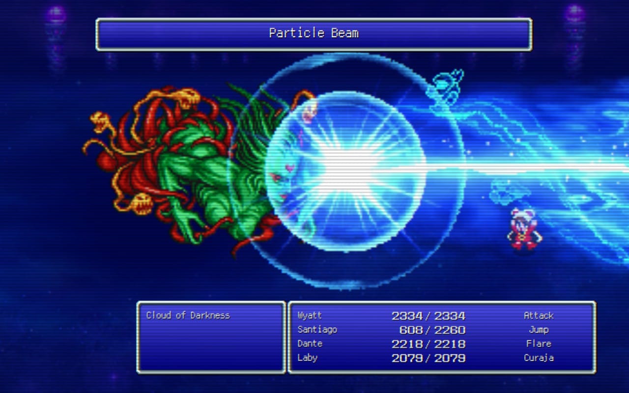 My favorite experiences in this section have to be either doing the resurrection dance against the two-headed dragon that could one-shot any of my characters, or using Dragoon to do massive jump damage. Well, technically Dragoon just does two turns worth of regular damage all at once by skipping a turn, but seeing the big number feels so good. All of this culminates in the final fight with Cloud of Darkness.