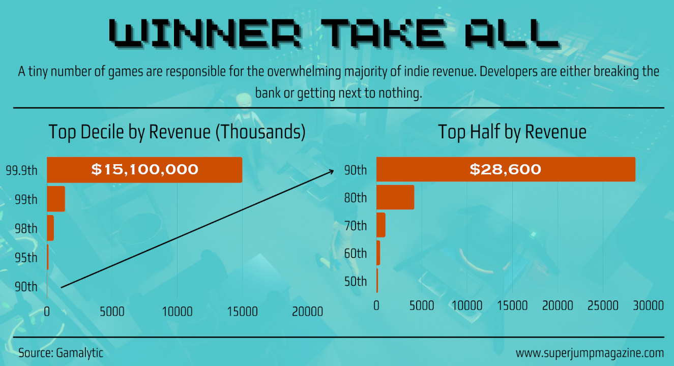 In a typical year, indies generate revenue somewhere between $2 billion and $3 billion, and that money is not equally distributed. Games from well-known studios, titles with trending gameplay styles, and viral hits are responsible for the lion's share of the money. In 2024, a record-setting year, the top 1.5% of indie games (those making approximately $1 million or more) generated more than half of all indie revenue.