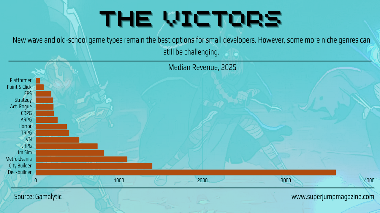 The general rule hasn't changed: Indie developers are strong where A-tier developers are weak. These stronger genres fall into two very different categories. First are the new wave genres essentially developed in the indie space, including open world survival, deckbuilders, and some roguelike subgenres. Second are traditional genres largely abandoned by A-tier companies, including city builders and many RPG subcategories. These are far and away the safest for upstart developers, as there is less risk of being overshadowed.