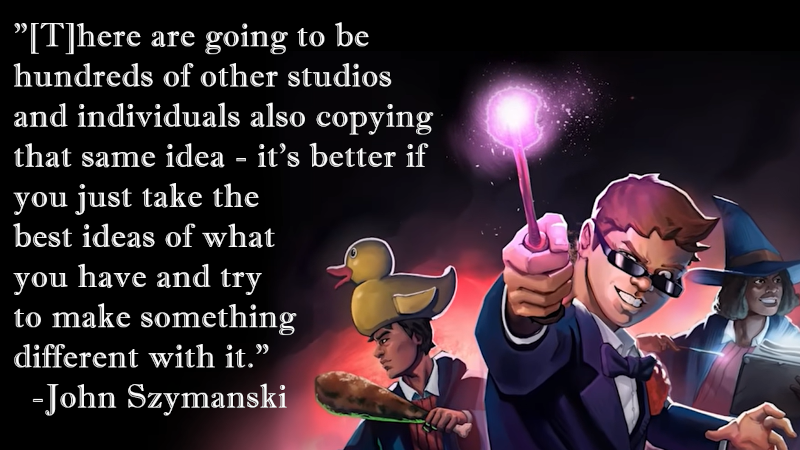 "[I]t's really easy to see something that does big numbers and just feel like you should try to copy that to ride the wave," says John Szymanski. "In reality, there are going to be hundreds of other studios and individuals also copying that same idea - it's better if you just take the best ideas of what you have and try to make something different with it."