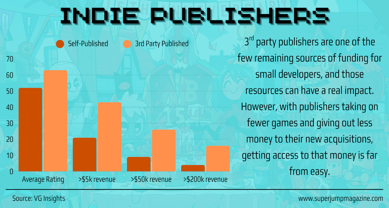 There's no question that games released through publishers do better on average than those that are self-published. An Over Powered Game Marketing analysis of games released in 2024 showed that third-party published games had a mean revenue twice as high and a median revenue five times higher than games without a publisher. Data from VG Insights backs this up, showing that third-party published games are twice as likely to earn at least $5000 and four times more likely to earn at least $200k.
