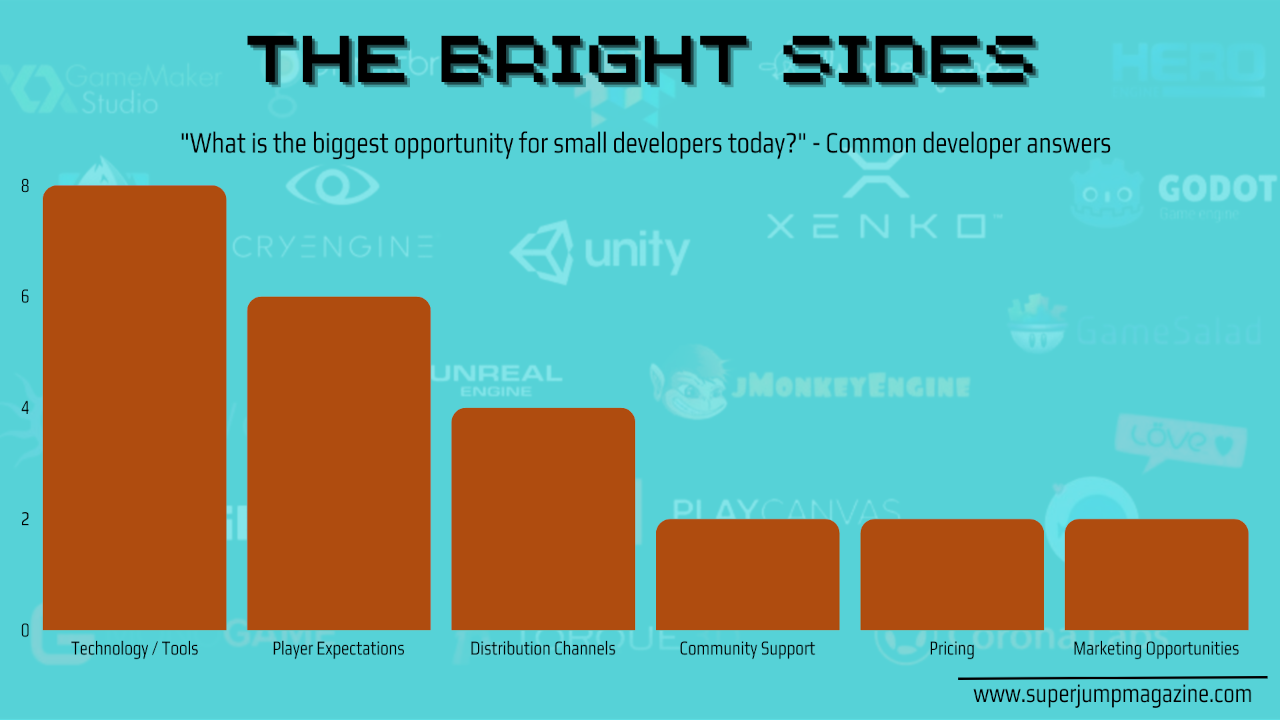 The developers are not at all in agreement on the state of the market. They are a mix of optimists and pessimists, idealists and realists. Yet even the most cynical among them are not without hope, and there's no one who would outright discourage someone from making a game. It's all a matter of knowing the angles.
