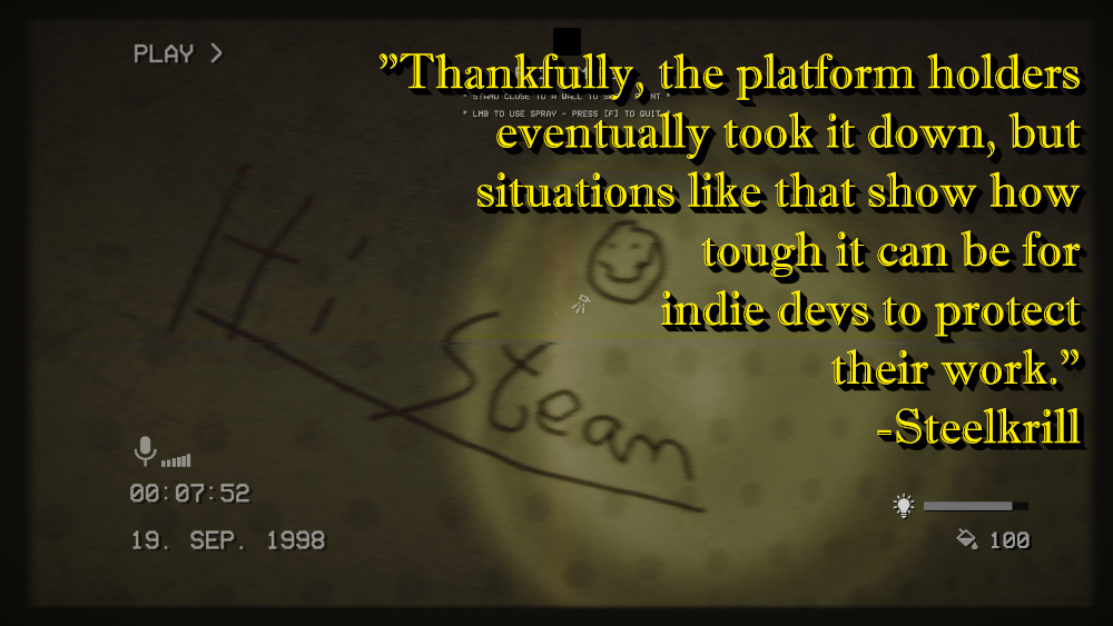 "[S]ituations like that show how tough it can be for indie devs to protect their work," says Steelkrill. "I still love what I do, but it's definitely getting harder on most parts."