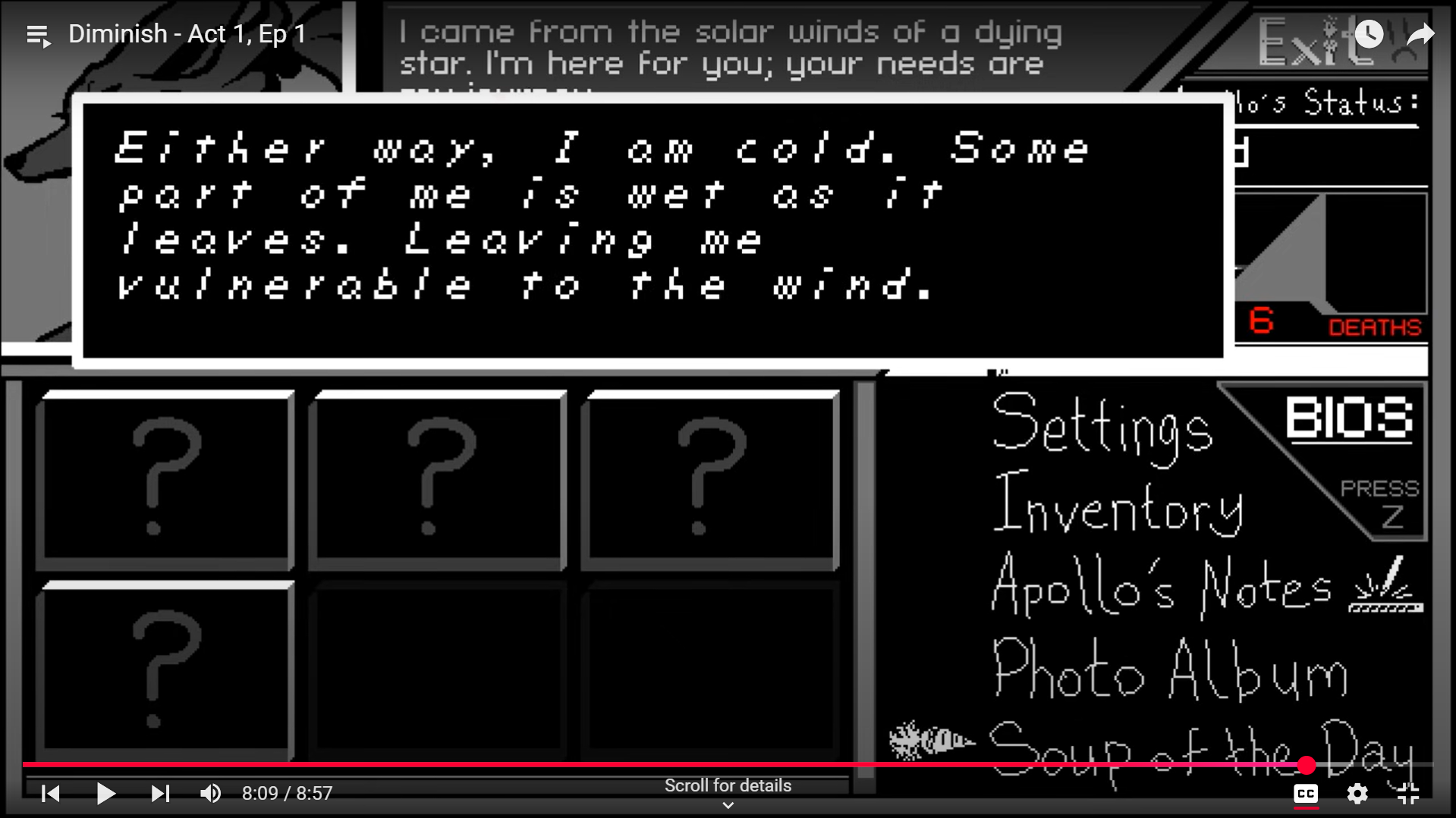 If you continue to watch this series, you start to understand that the game is telling an oddly personal story to Paul that starts to taunt him as it continues. The crux of this story follows a warping of our understanding of the self-playing DEMO mode seen in many arcade games or some console games. The DEMO mode is meant to show potential players what the game looks like before they have to spend their hard-earned quarters to play. What is less known about DEMO mode is that this is typically not a video or a screen recording. DEMO mode loads into the actual game and the game is given the autonomy to play itself, the same way a player would. It’s an engaging series to watch that twists the role of game and player in incredible ways if you have the patience to stick with a slow-burning mystery.