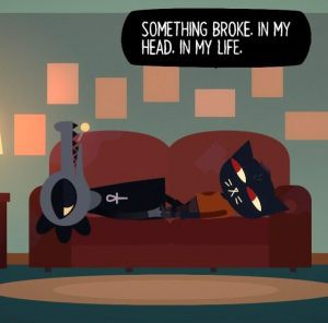 For the unfamiliar, players take on the role of distressed twenty-year-old Mae Borowski. She happens to be a black cat with a healthy sense of melancholy and self-described “nightmare eyes.” Mae has just returned back home after an unnamed incident that involved suddenly dropping out of college. She does what many of that age living with their parents without bills or responsibilities would do: sleep late and hang out with friends. Over 50% of Night in the Woods consists simply of waking up, exploring around town, and eventually finding an available friend to socialize with.